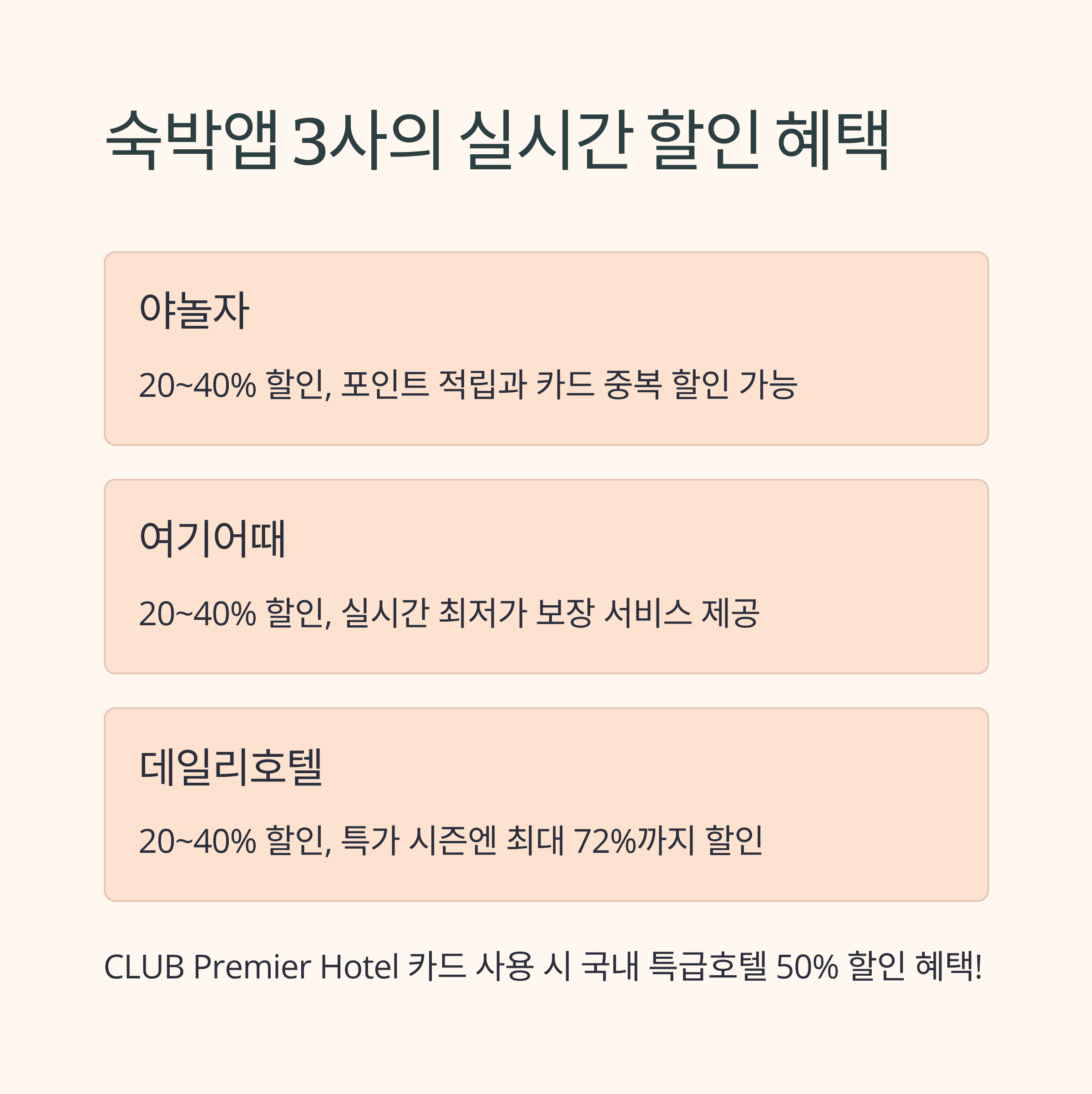 숙박앱 3사에서는 실시간 예약 시 상시 20%~40% 할인이 적용됩니다.