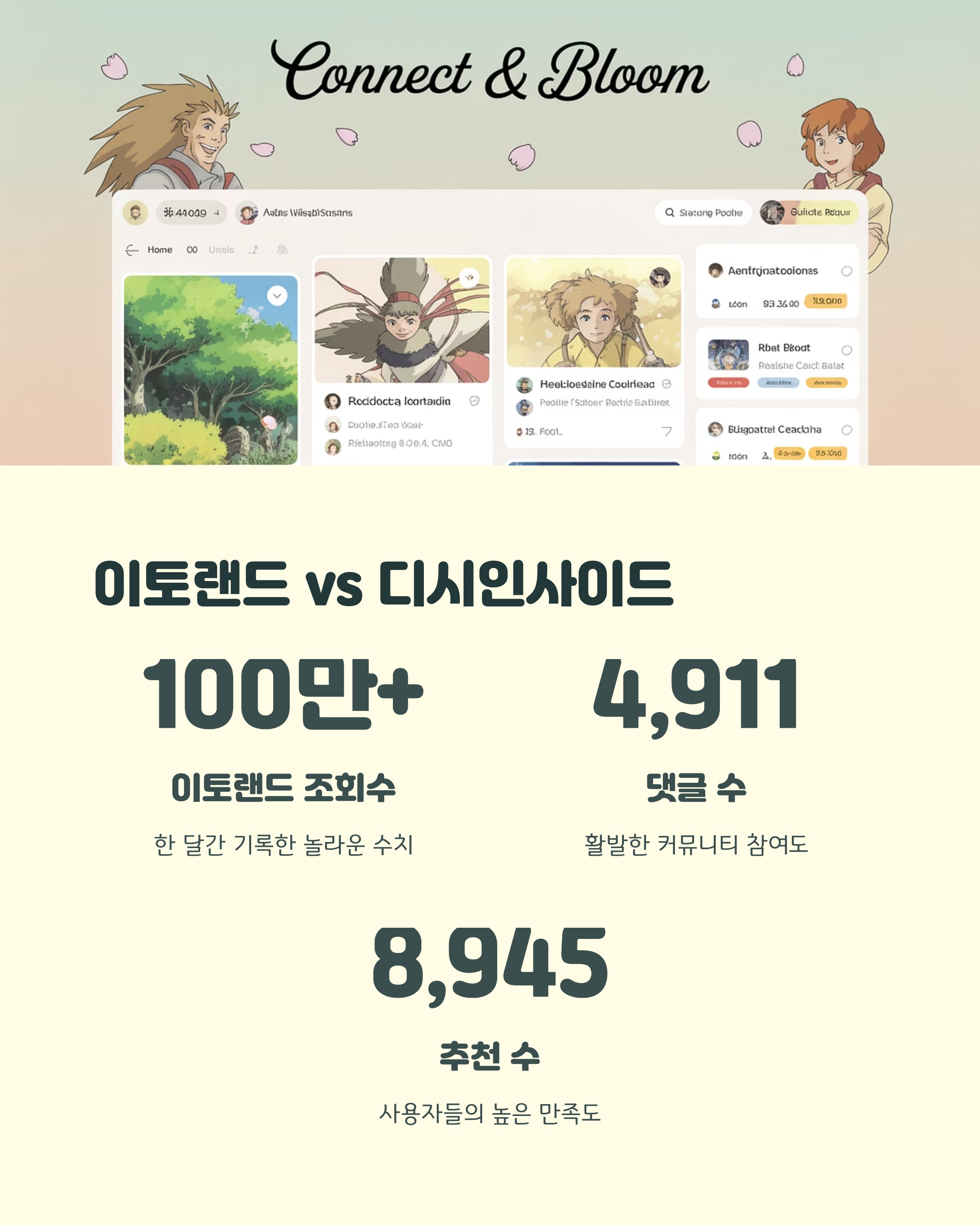 이토랜드는 한 달간 100만 회 이상의 조회수를 기록했고, 댓글 4,911개, 추천수 8,945회라는 엄청난 수치를 자랑했습니다. 반면 디시인사이드는 댓글 수에서 오히려 앞섰는데요. 그만큼 활발한 참여가 이루어졌다는 의미겠죠.