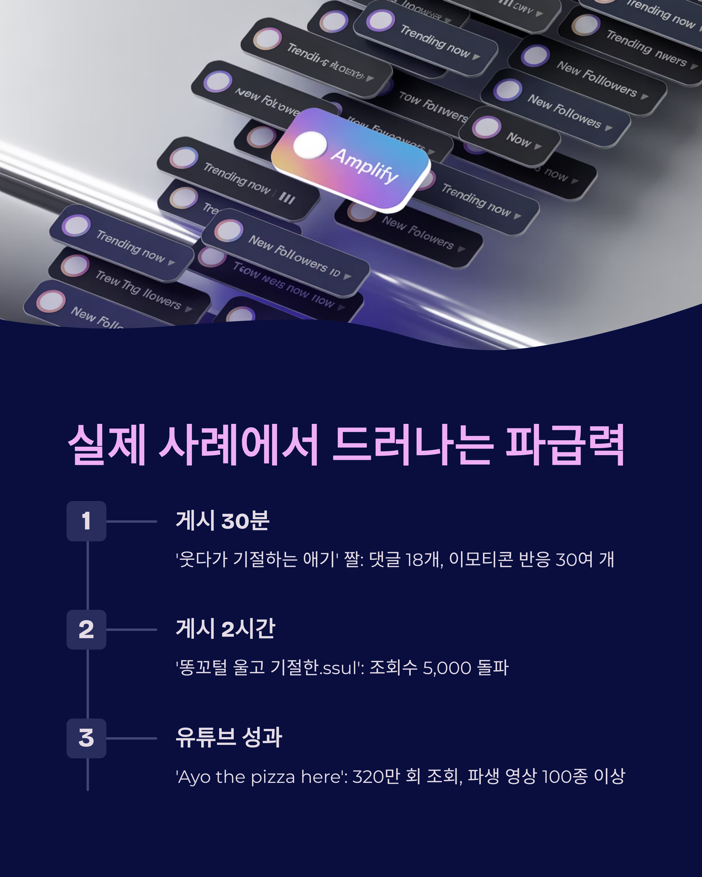 예를 들어, ‘웃다가 기절하는 애기’ 짤은 게시 30분 만에 댓글 18개, 이모티콘 반응 30여 개를 기록했습니다. 또 ‘똥꼬털 울고 기절한.ssul’은 게시 2시간 만에 조회수 5,000을 돌파했습니다. 해외 밈 ‘Ayo the pizza here’는 유튜브에서 320만 회 이상 조회되며 파생 영상이 100종 이상 등장했습니다.