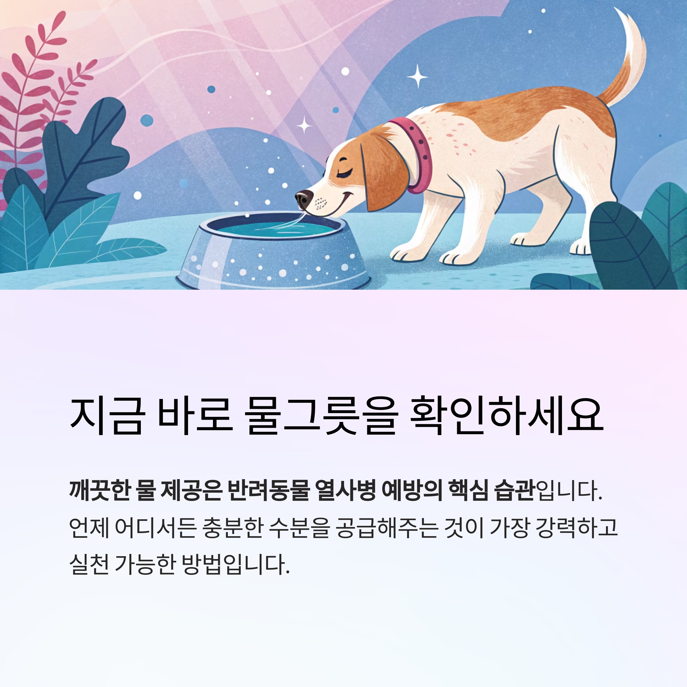 ‘깨끗한 물 제공’은 반려동물 열사병 예방의 핵심 습관입니다.