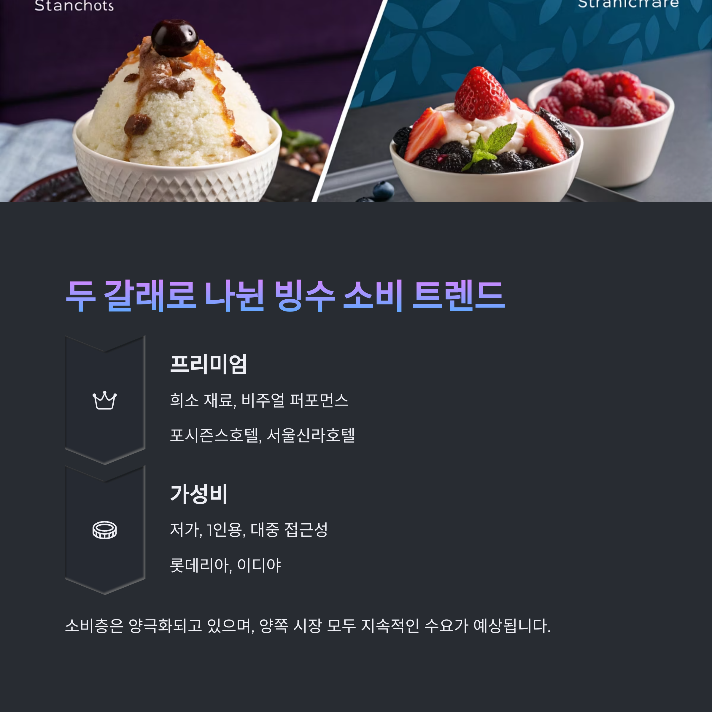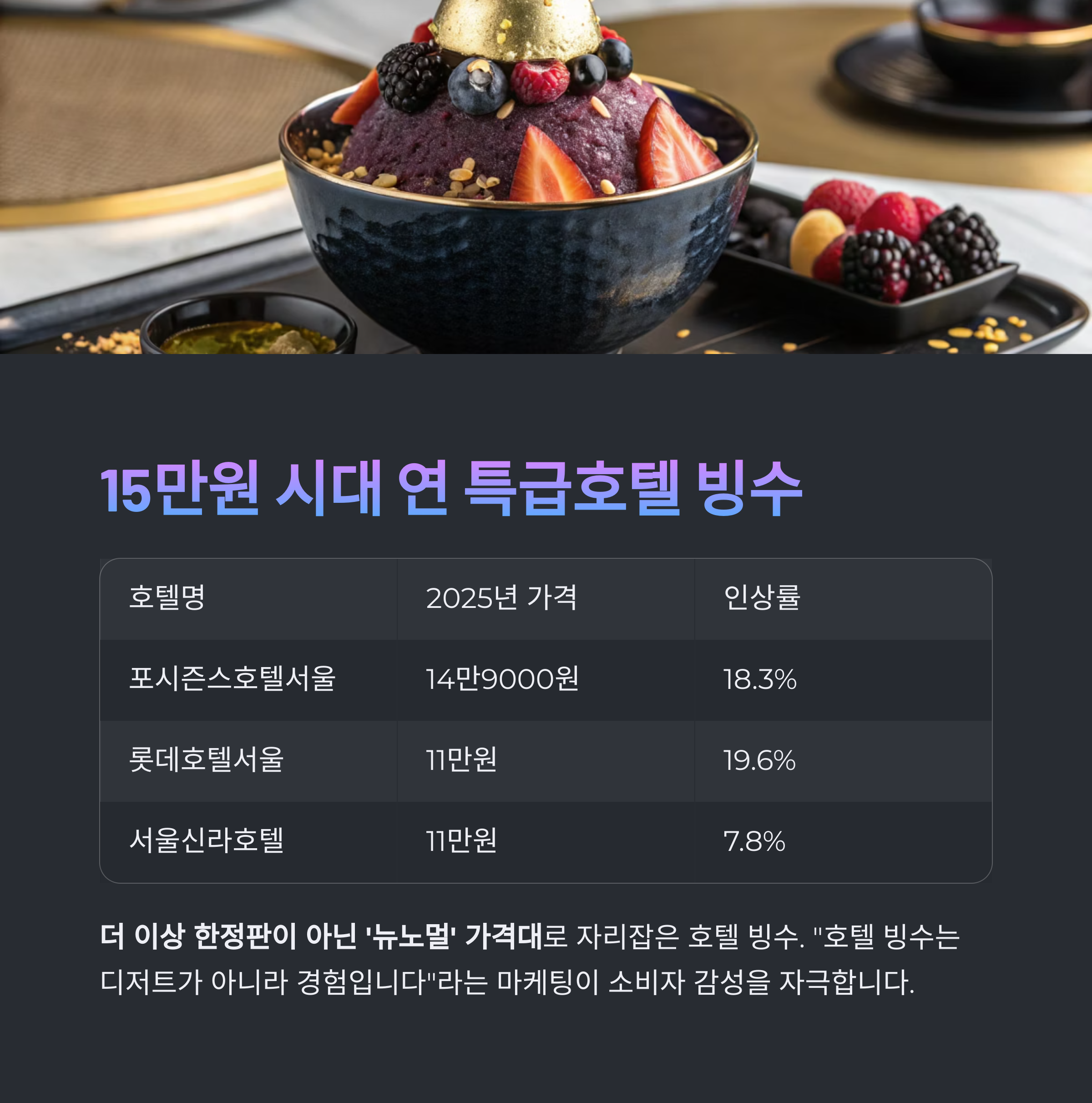 호텔 빙수는 ‘고급 경험’의 상징이자 SNS 콘텐츠로 기능하며, 프리미엄 시장의 수요를 지탱하고 있습니다.