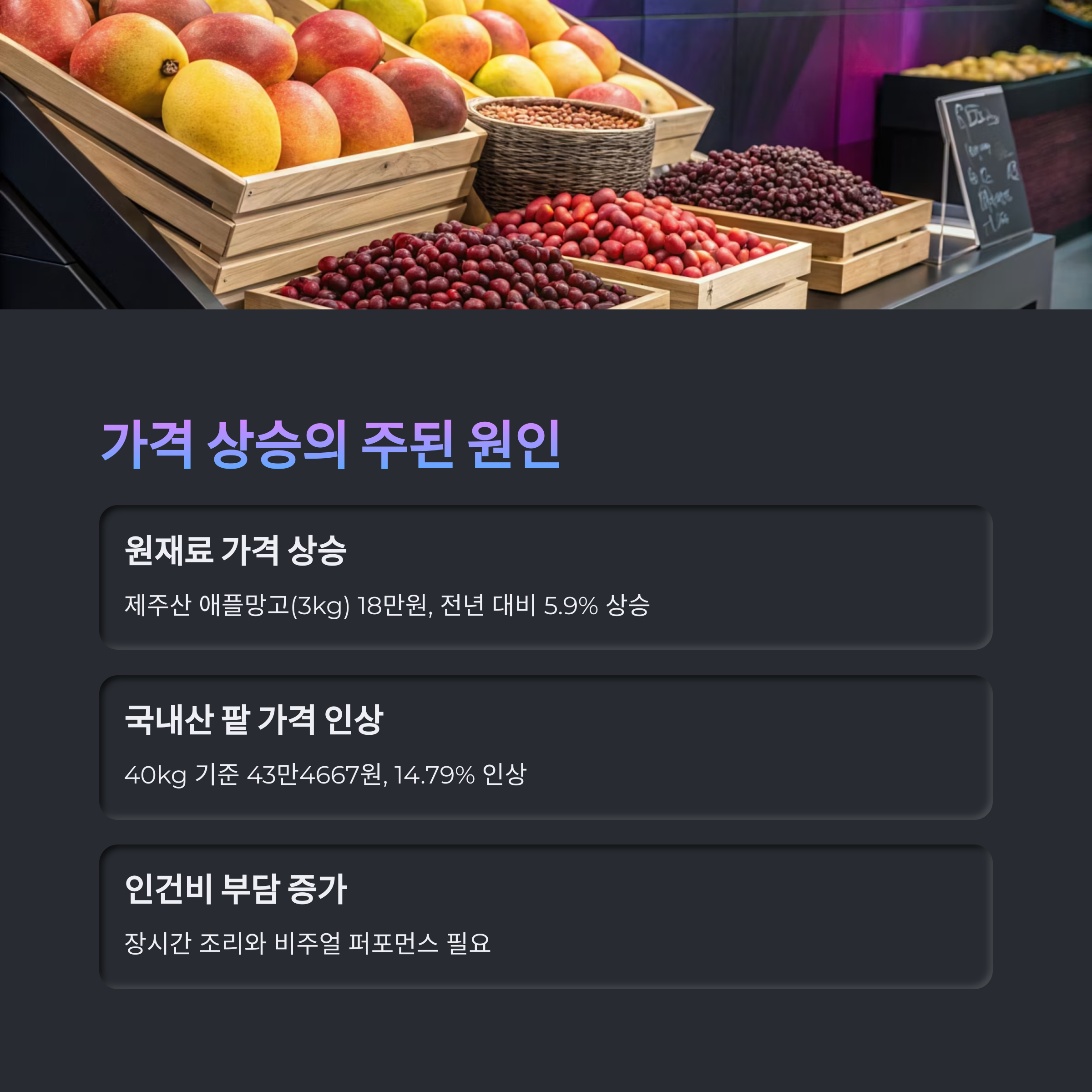 가격 인상의 주된 배경으로는 제주산 애플망고와 국내산 팥의 도매가 상승이 지목됩니다.