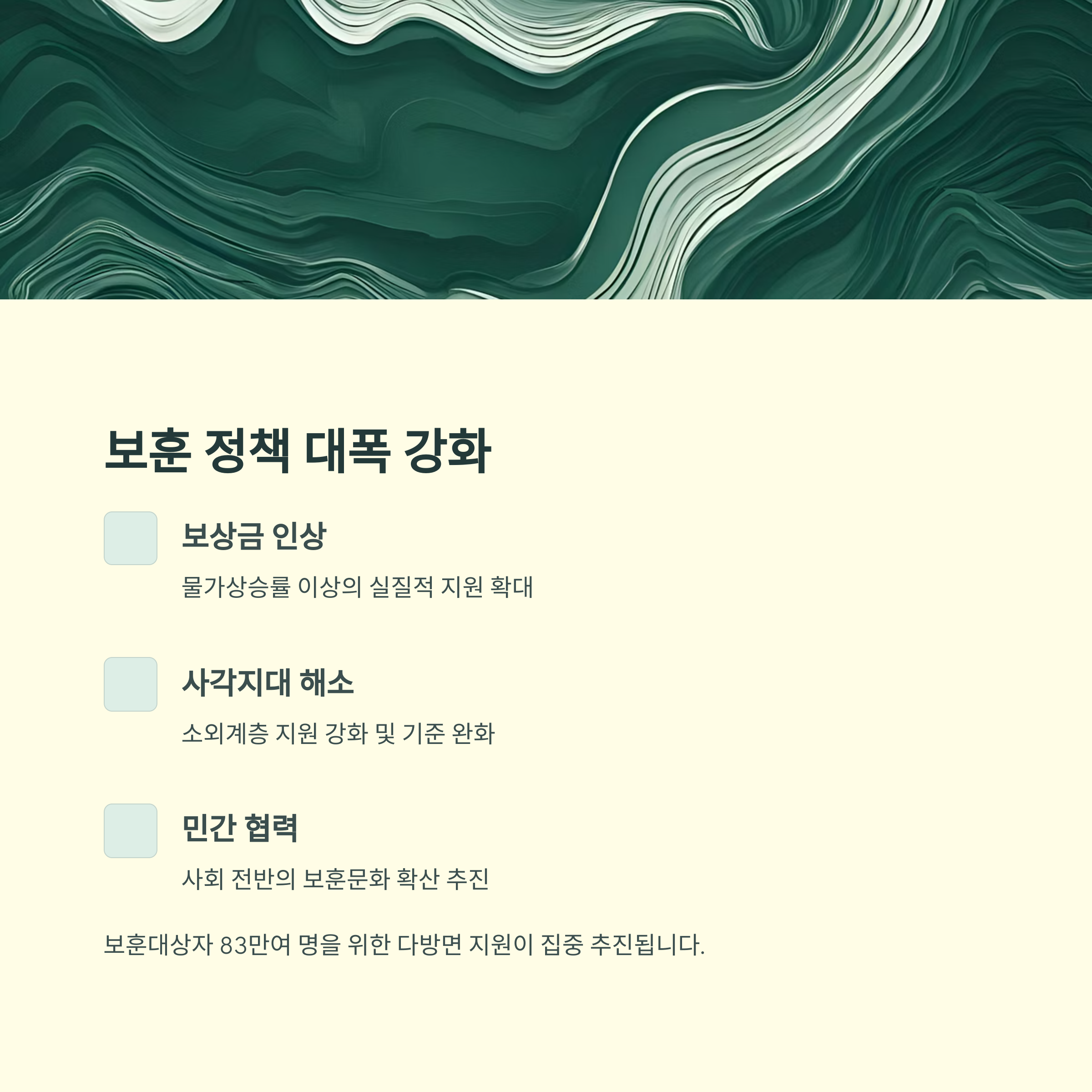 보상금 인상, 생활지원 확대, 의료·복지 서비스 강화 등 핵심 제도를 분야별로 정리해드립니다