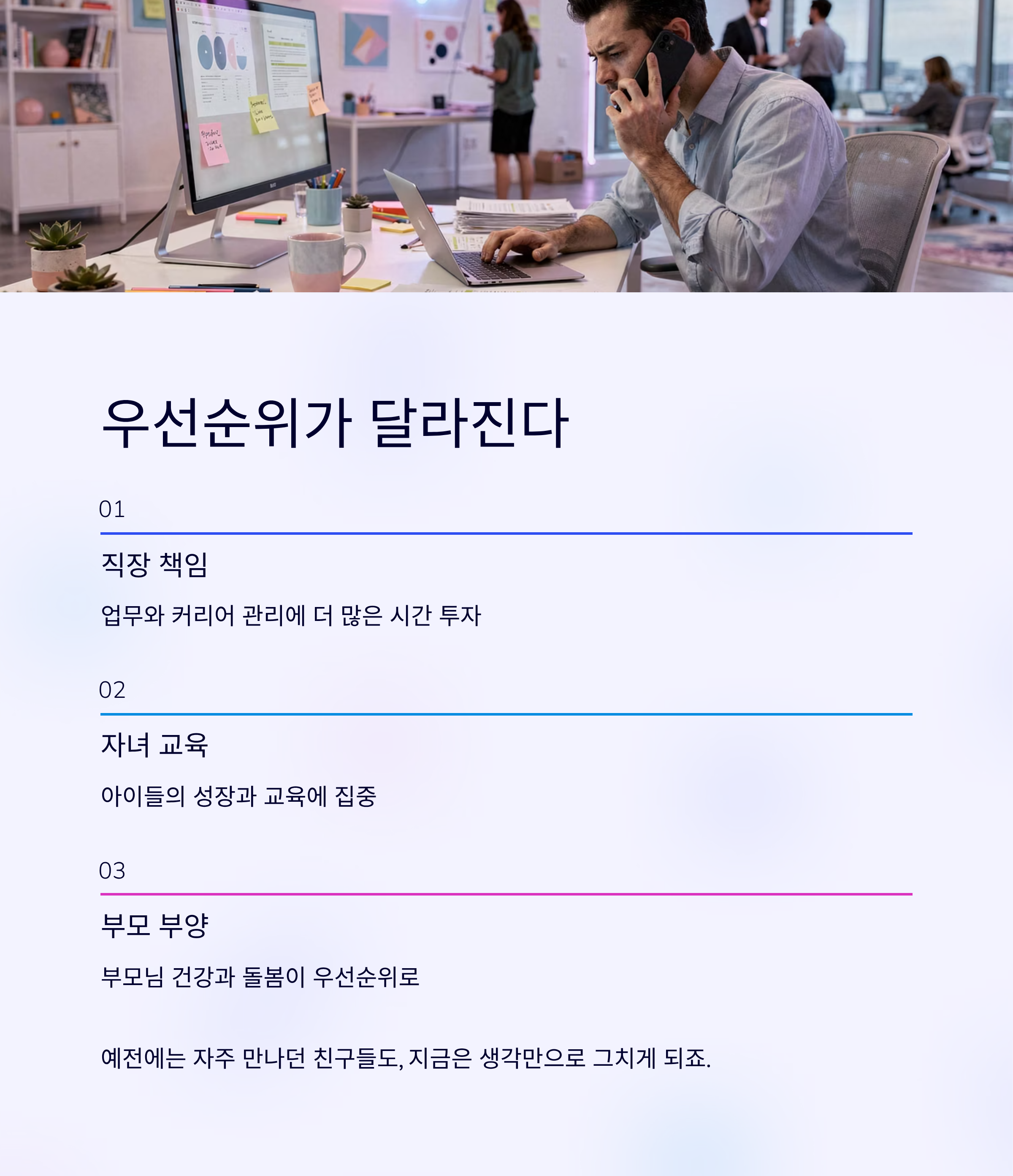 직장에서의 책임, 자녀 교육, 부모 부양 등으로