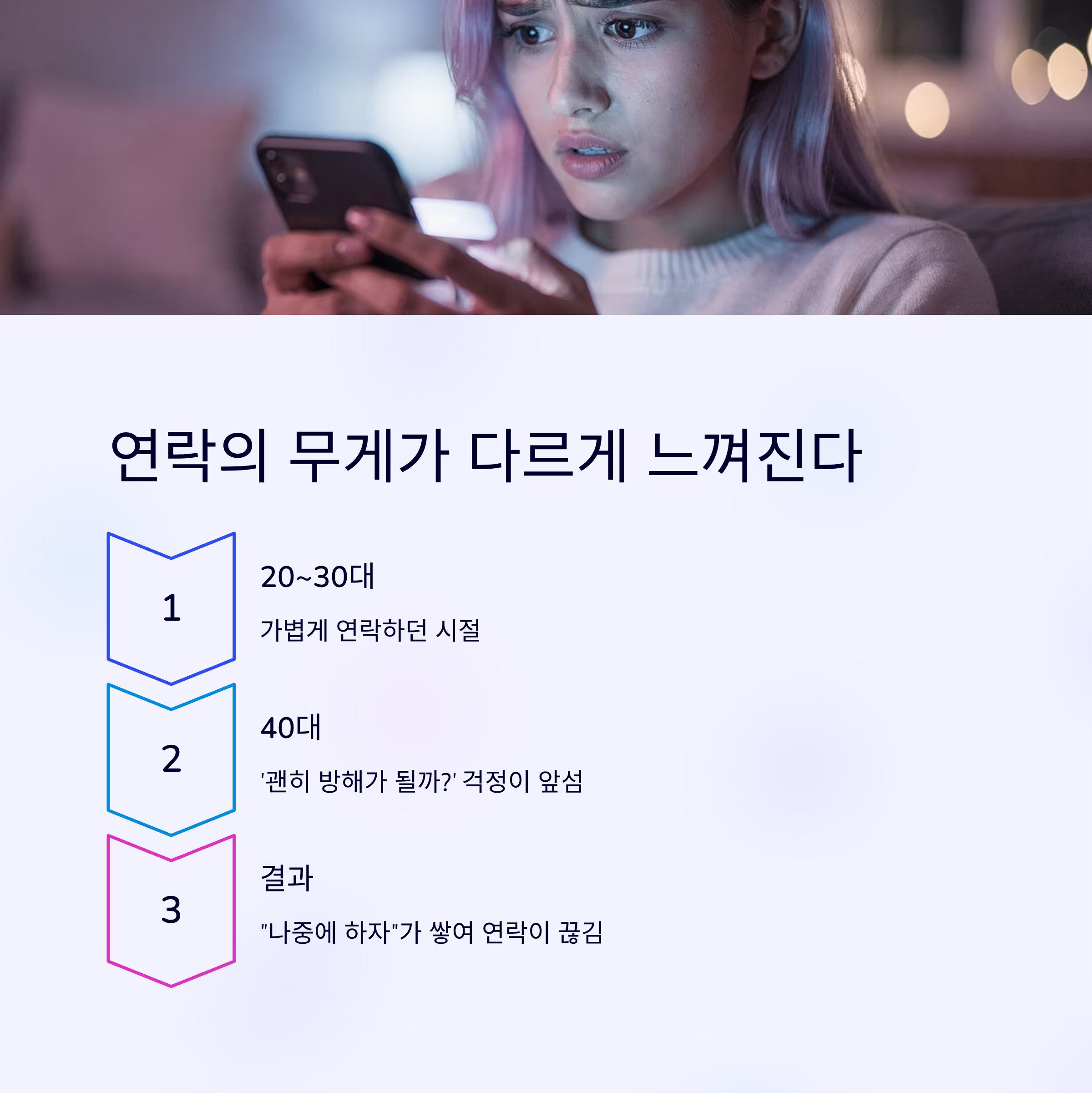 연락 하나 하는 것도 이유가 필요해지고, 타이밍을 재게 되죠.