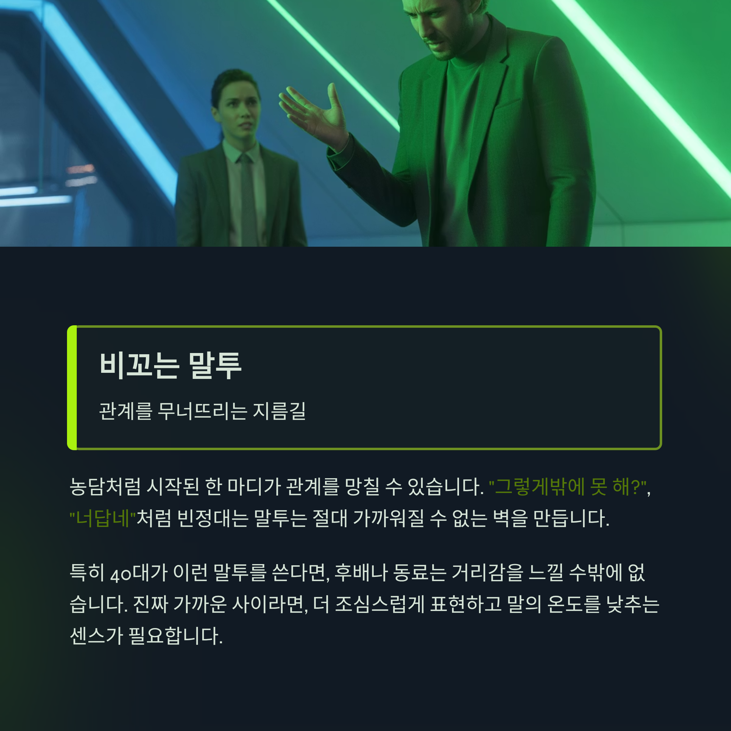 특히 40대가 이런 말투를 쓴다면, 후배나 동료는 거리감을 느낄 수밖에 없습니다.
