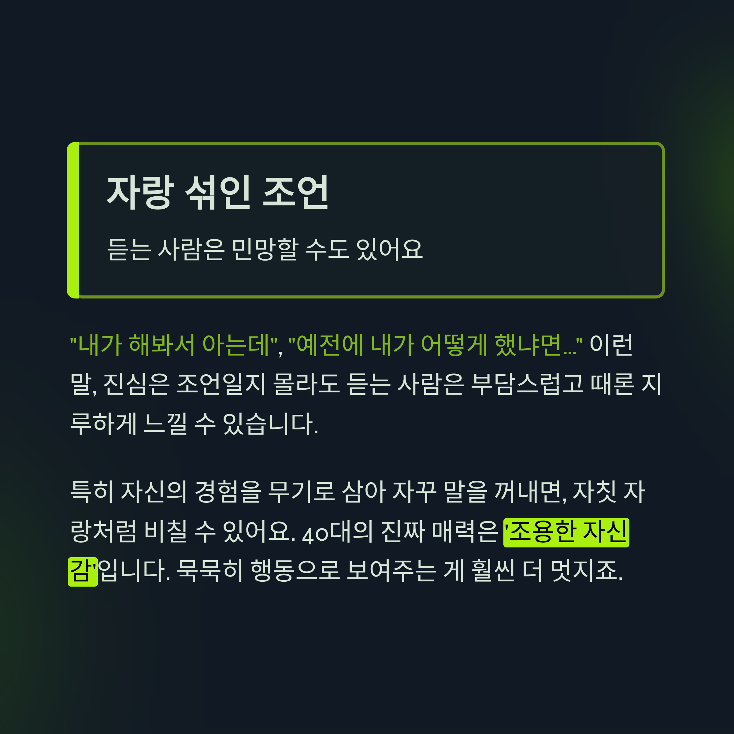 특히 자신의 경험을 무기로 삼아 자꾸 말을 꺼내면, 자칫 자랑처럼 비칠 수 있어요.