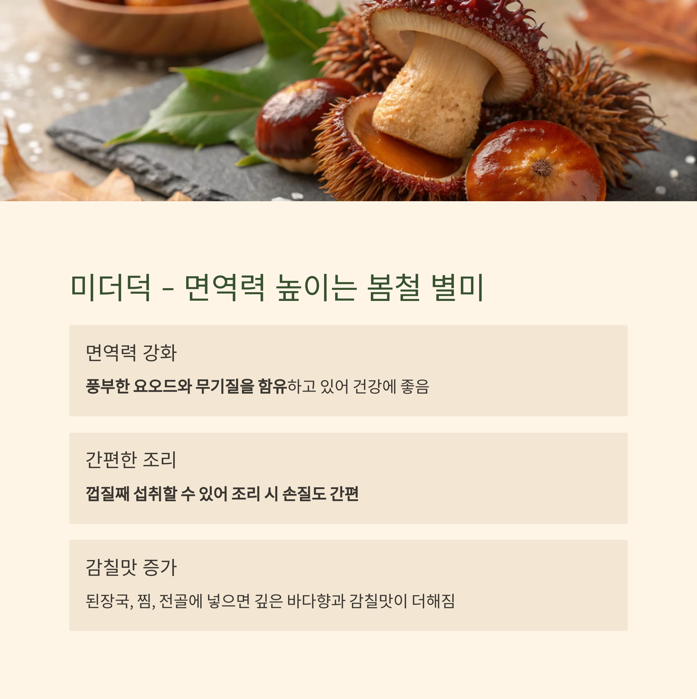 | 미더덕 | 요오드, 무기질 | 껍질째 섭취 가능 |
