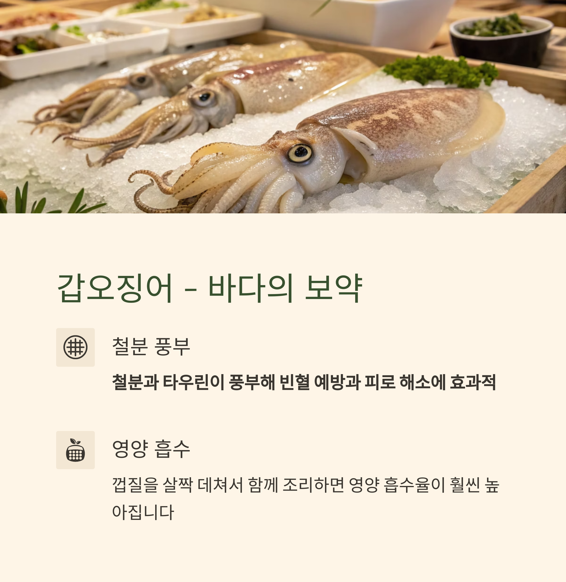 | 갑오징어 | 타우린, 철분 | 데쳐서 섭취 가능 |