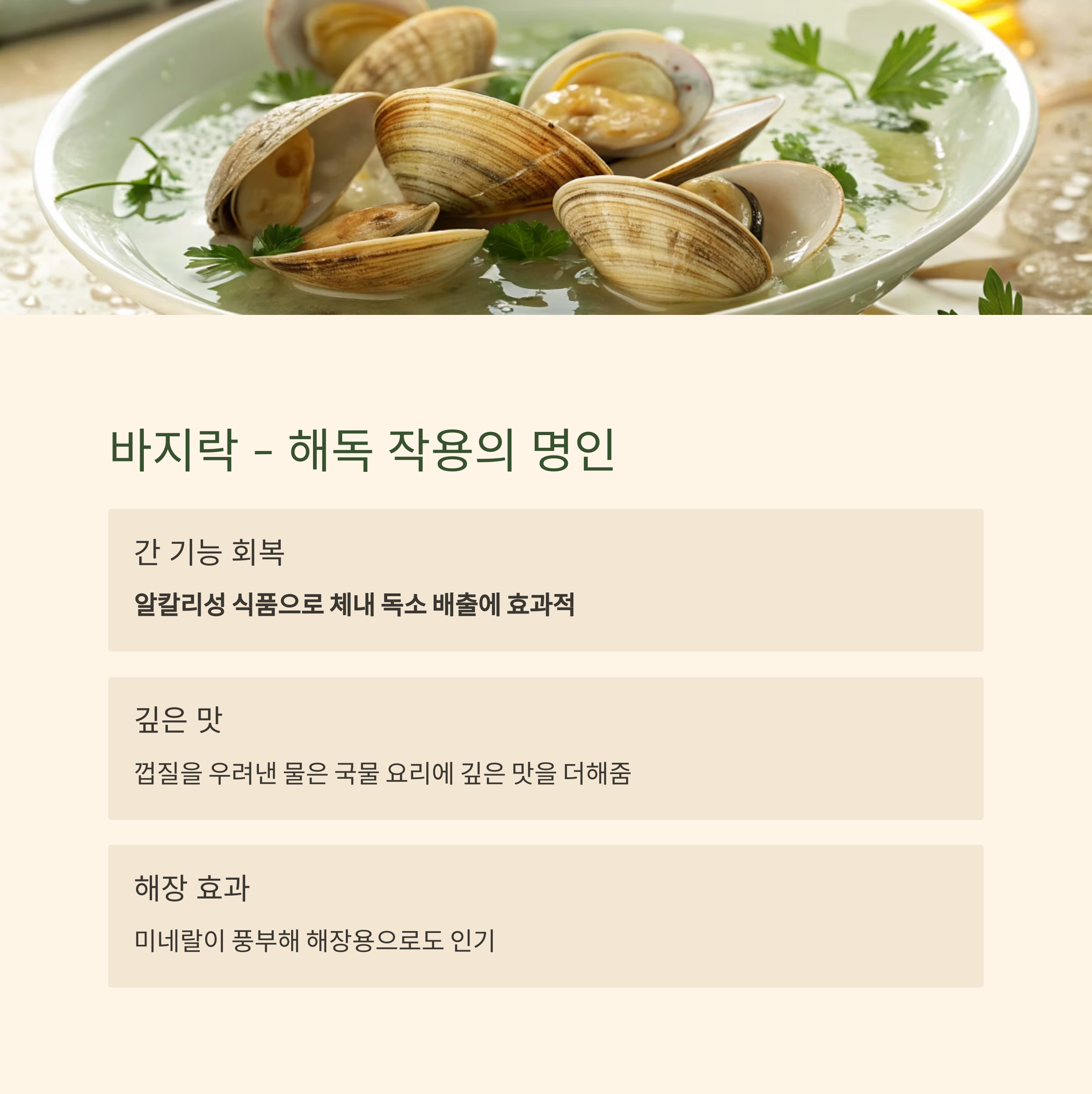 바지락은 간 기능을 회복시키는 데 탁월하며, 알칼리성 식품으로 체내 독소 배출에 효과적입니다.