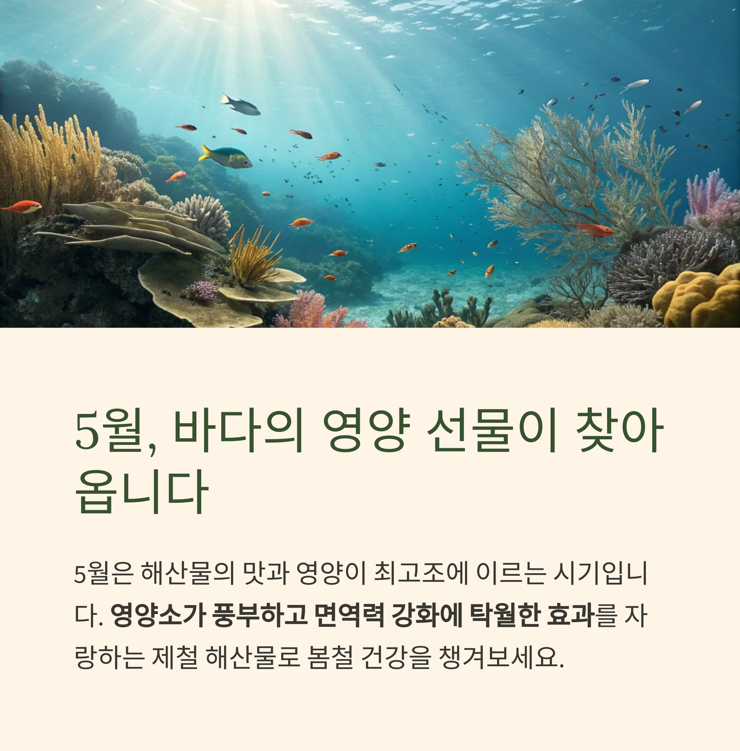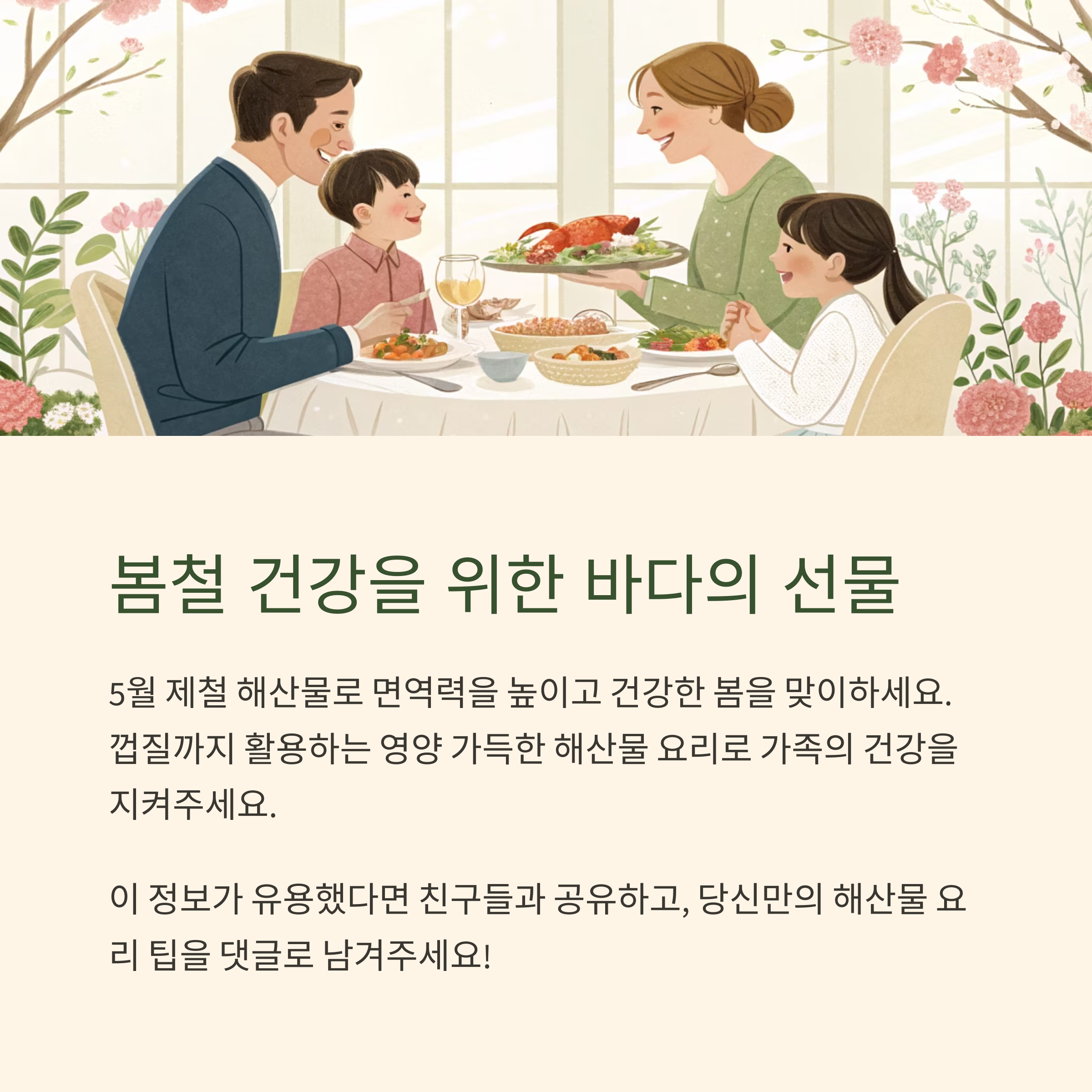 5월은 바다가 가장 풍요로운 시기 중 하나로, 해산물의 맛과 영양이 최고조에 이르는 시점입니다.