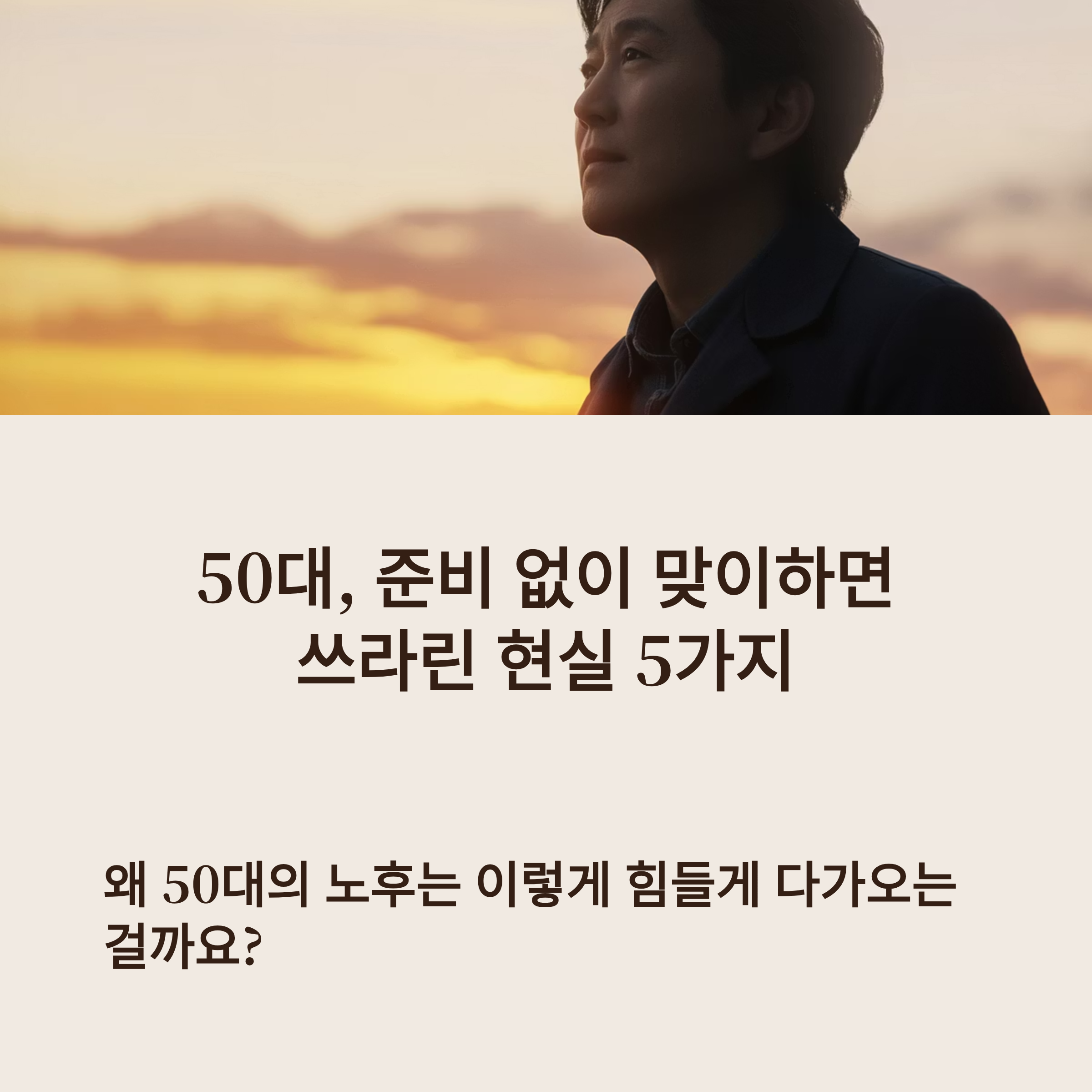 50대는 인생의 황금기이면서도, 동시에 노후를 향한 현실적인 문턱입니다. 하지만 아무런 준비 없이 이 시기를 맞이한다면 경제적, 사회적, 심리적으로 복합적인 난관에 빠지기 쉽습니다. 지금 이 글에서는 준비 없는 50대가 마주하는 혹독한 현실 다섯 가지를 짚어보며, 그 무게를 함께 생각해보려 합니다.