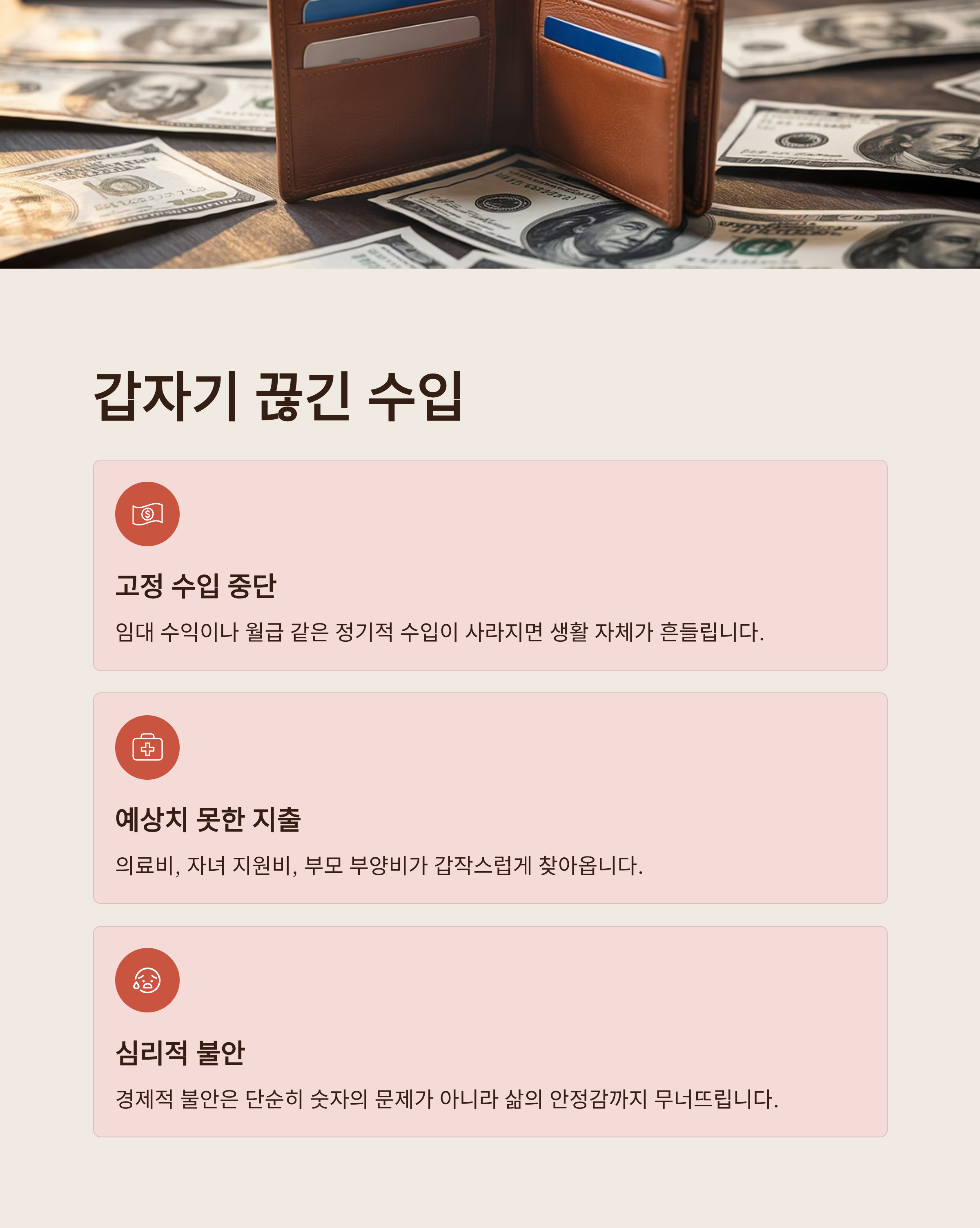 50대가 되면 고정적인 수입이 사라지는 경우가 많습니다. 특히 임대 수익이나 월급처럼 정기적인 수입에 의존하던 경우라면, 생활 자체가 흔들릴 수 있습니다.