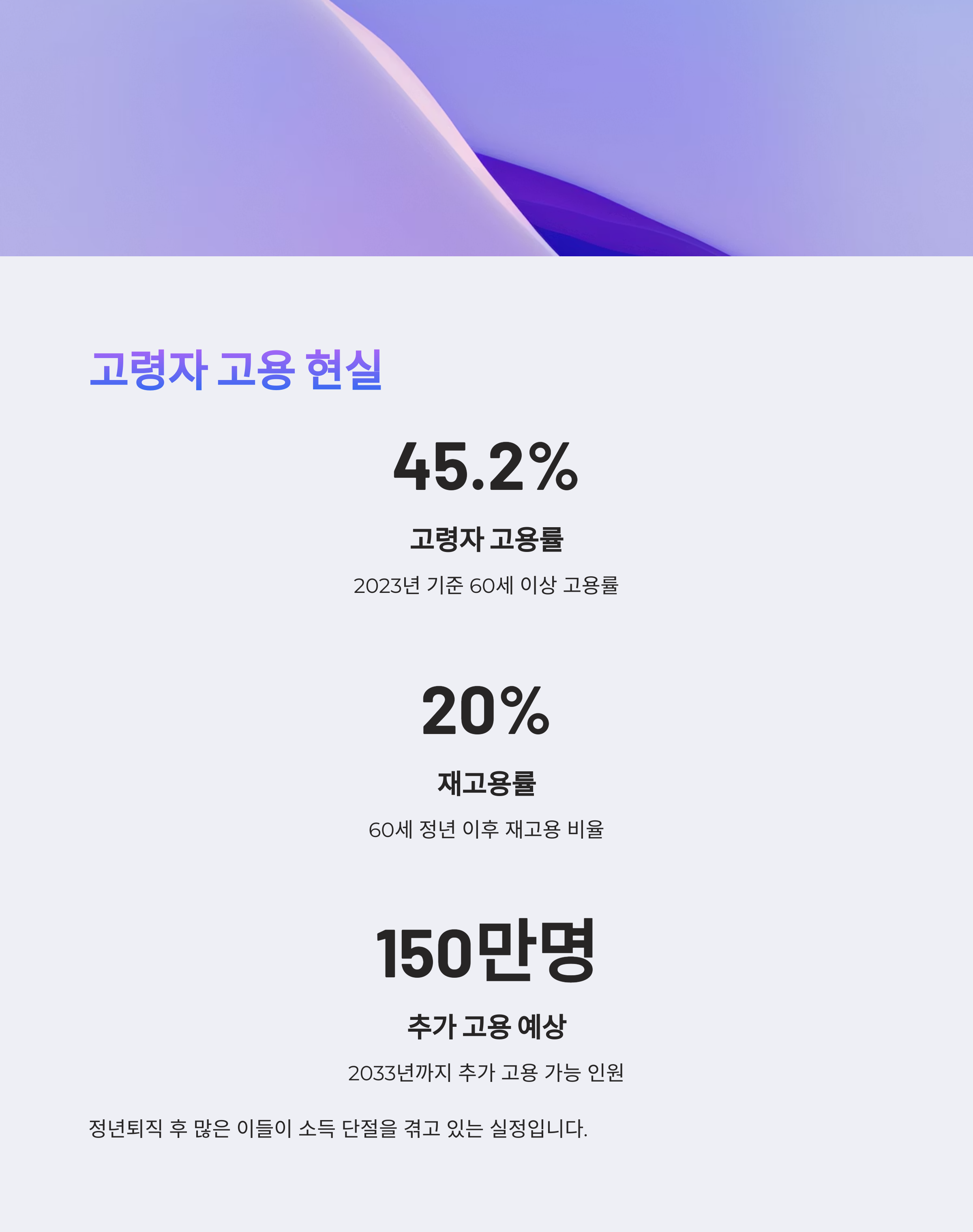 2023년 기준 60세 이상 고령자 고용률은 약 45.2%에 불과합니다.