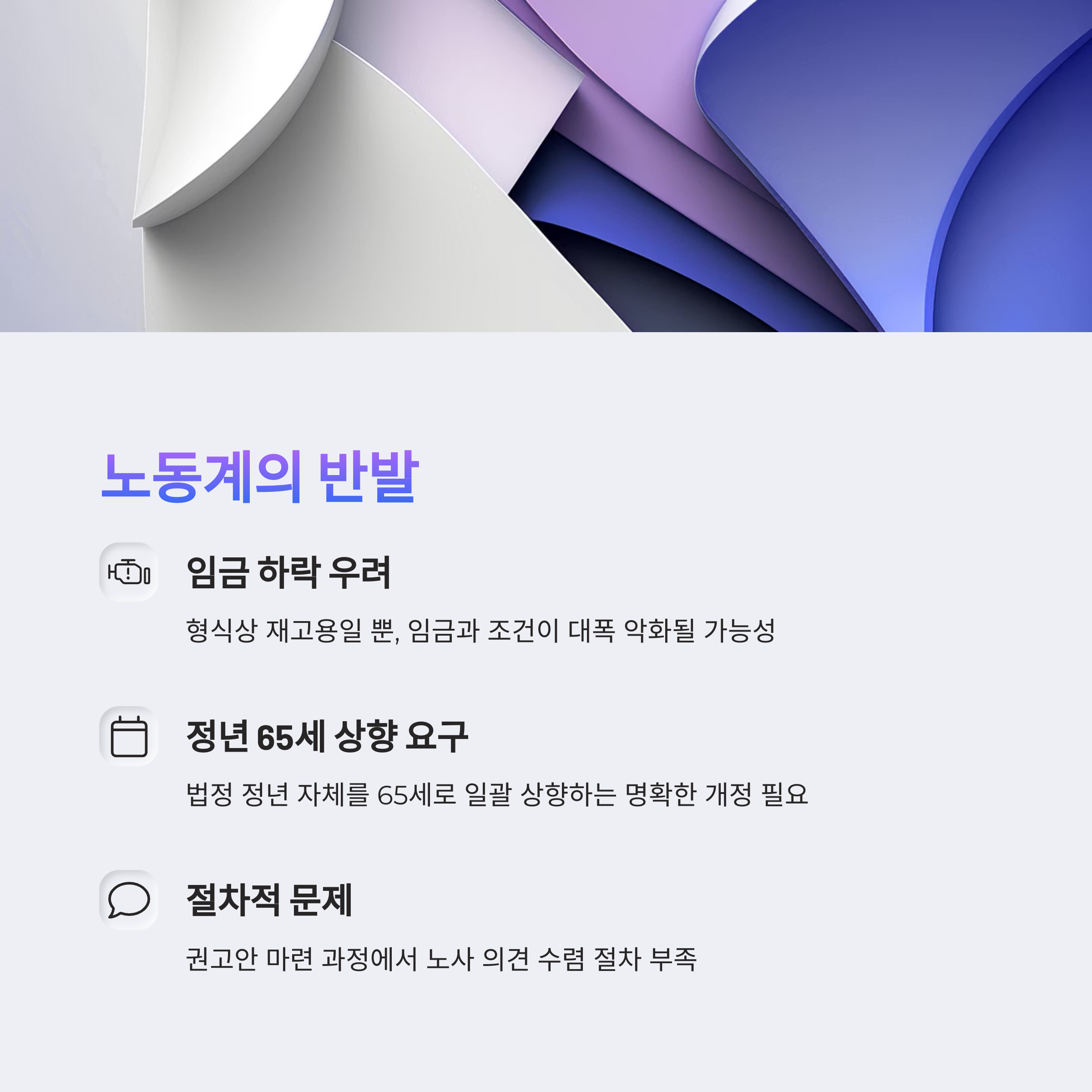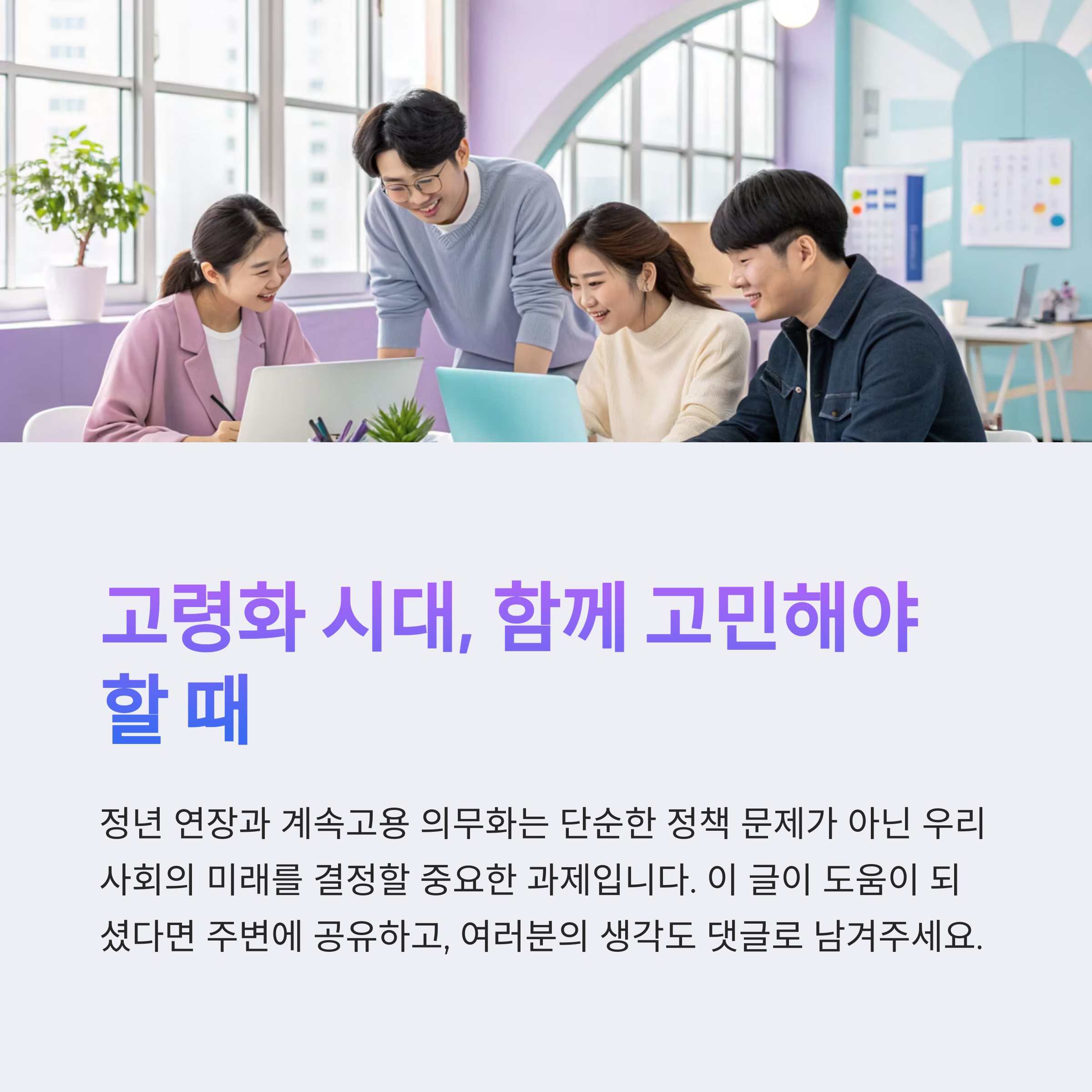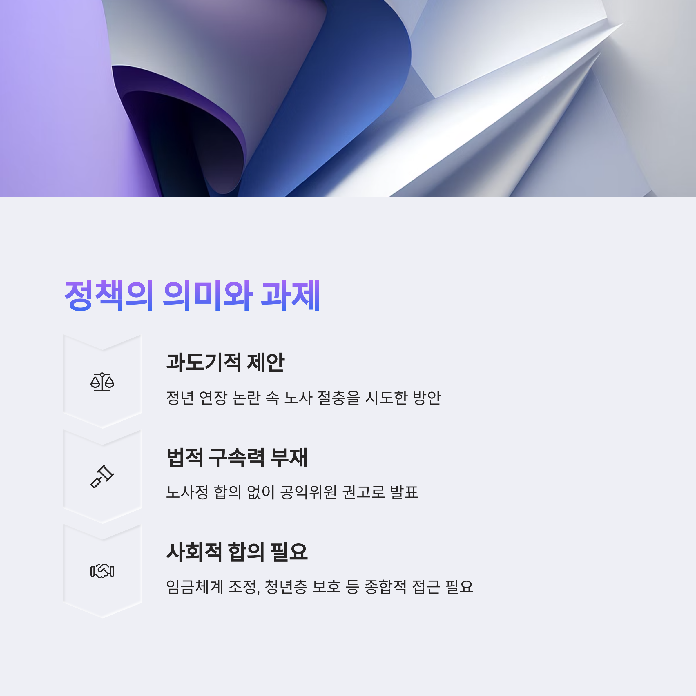 향후 정년제도 전면 개편, 임금체계 조정, 청년층 보호를 포함한 종합적인 사회적 합의가 절실합니다.