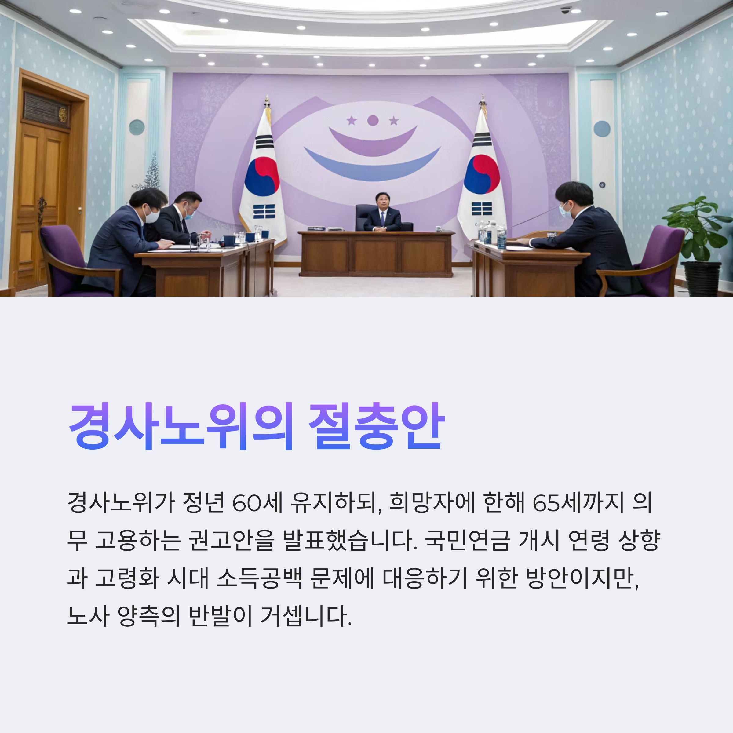 이번 권고안은 정년 연장 논란 속에서 노사 절충을 시도한 과도기적 제안입니다.