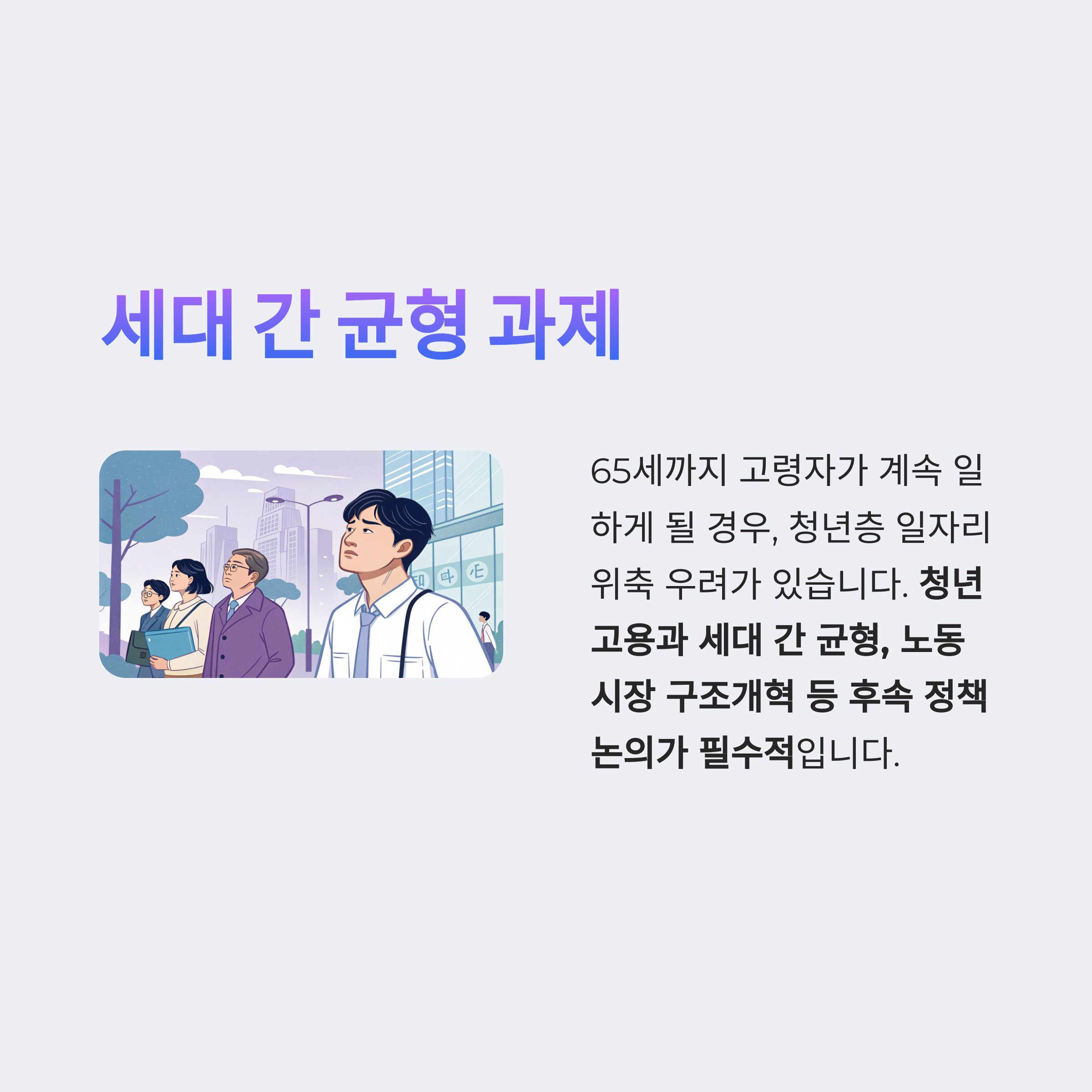 65세까지 고령자가 계속 일하게 될 경우, 청년층의 일자리 위축 우려도 존재합니다.