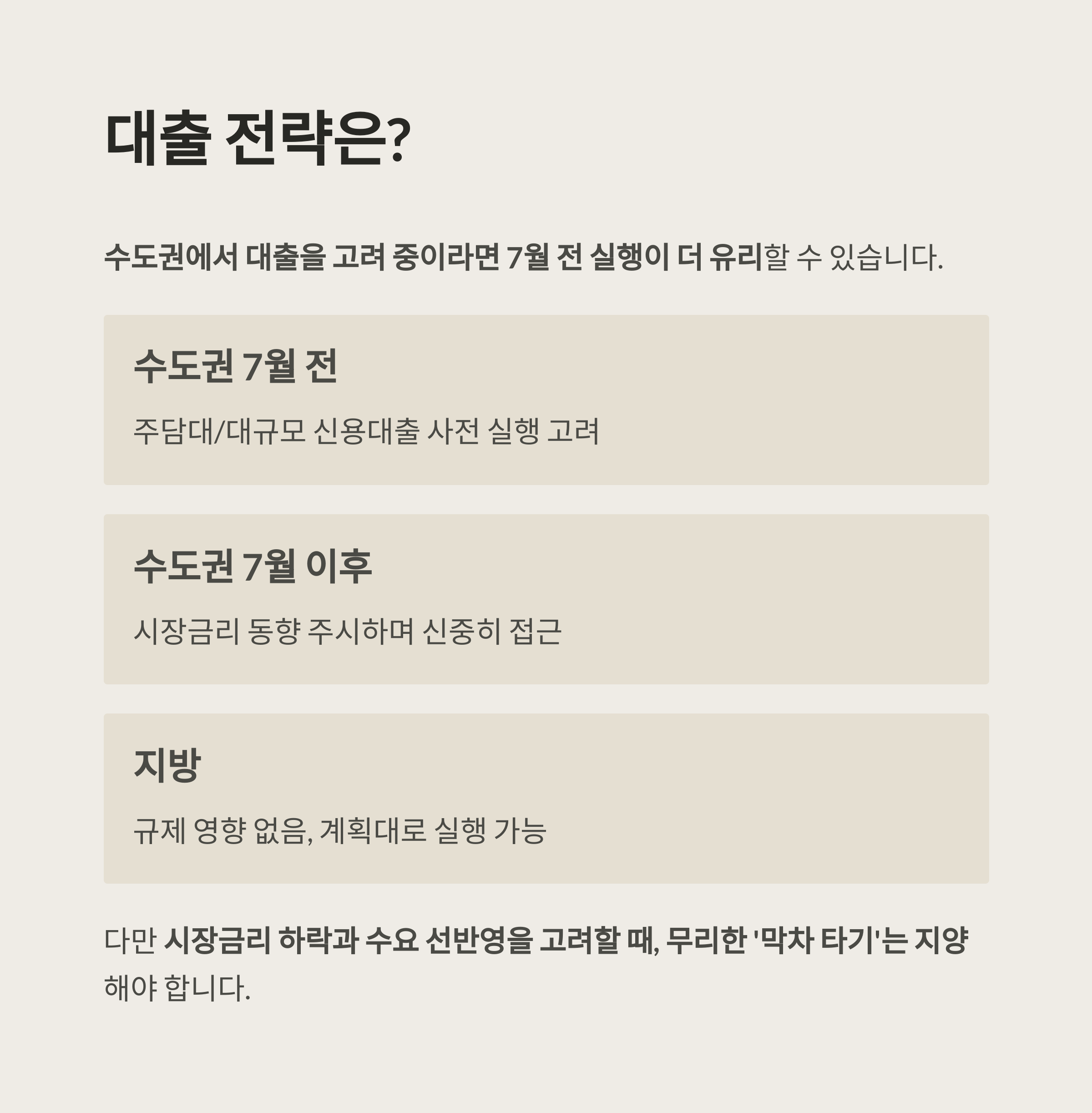 | 수도권 | 7월 전 | 주담대/대규모 신용대출 시 사전 실행 고려 |