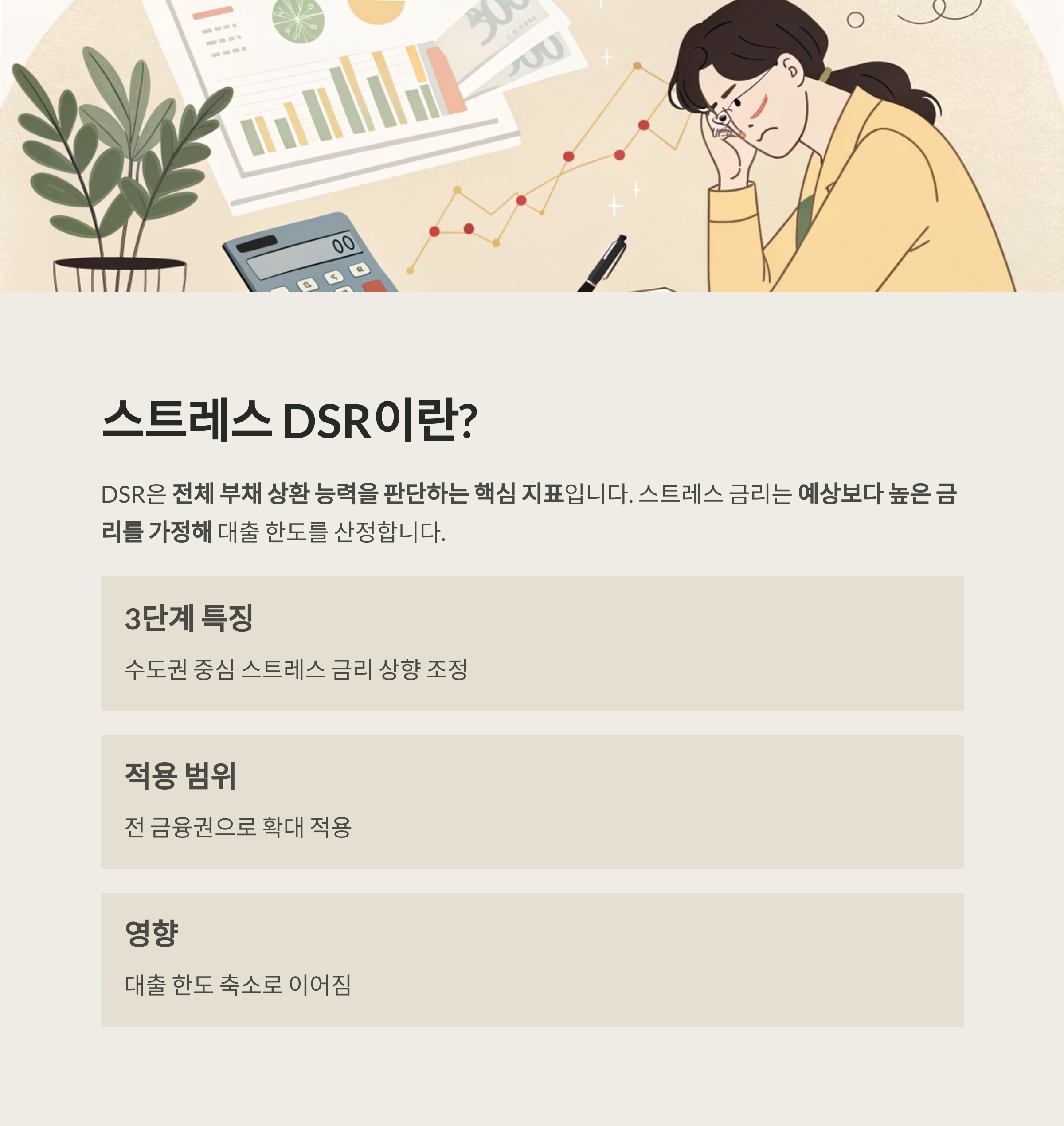 DSR은 대출자의 전체 부채 상환 능력을 판단하는 핵심 지표로, 스트레스 금리는 예상보다 높은 금리를 가정해 대출 한도를 산정하는 방식입니다. 이번 3단계에선 수도권을 중심으로 이 스트레스 금리를 상향 조정하고, 적용 대상을 전 금융권으로 확대하는 것이 특징입니다.