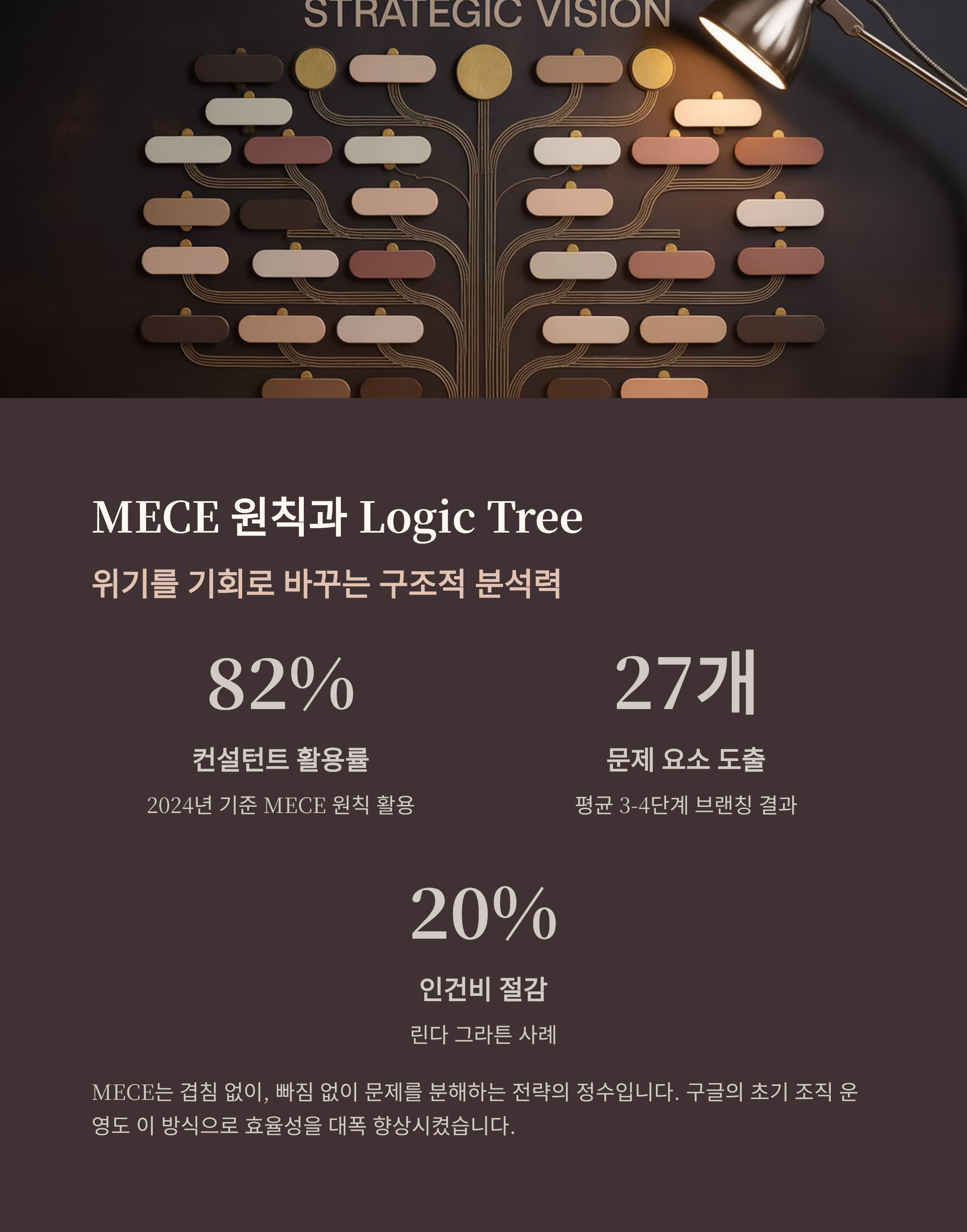| MECE / Logic Tree | 82% | 문제 27개 세분화, 해법 도출 시간 35% 단축 |