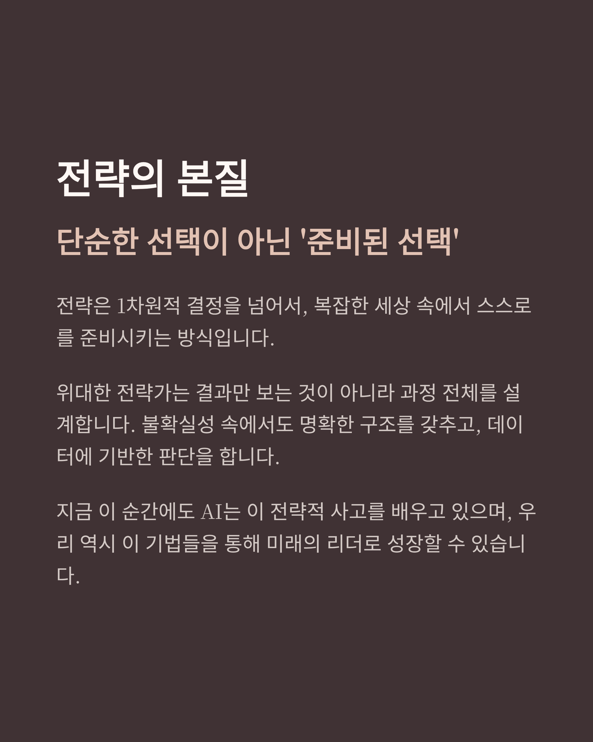 전략은 1차원적 결정을 넘어서, 복잡한 세상 속에서 스스로를 준비시키는 방식입니다.