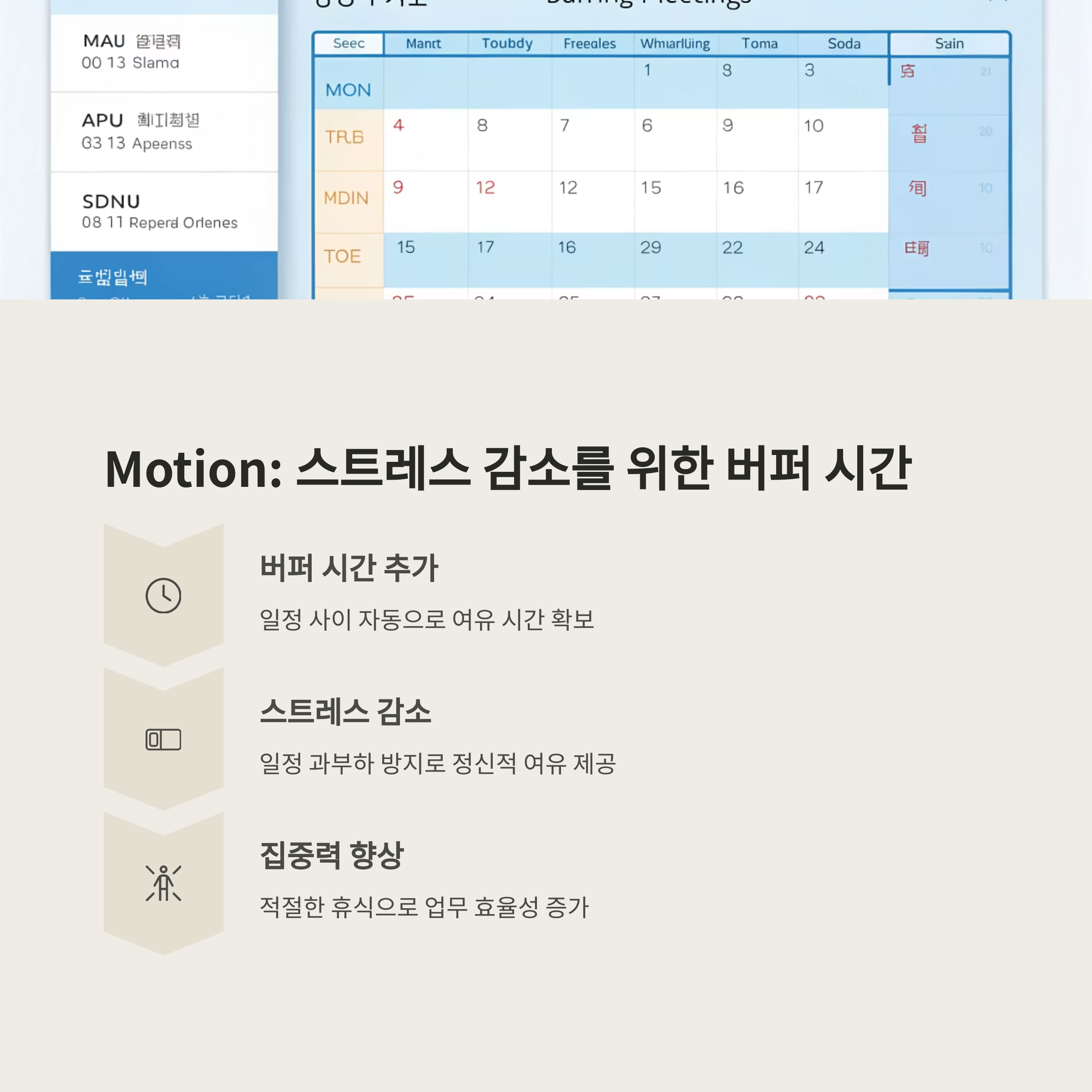 작업 요약과 팀 협업 지원 기능 집중 시간 확보와 일정 자동 최적화 컨텍스트 전환 최소화 및 버퍼 시간 제공