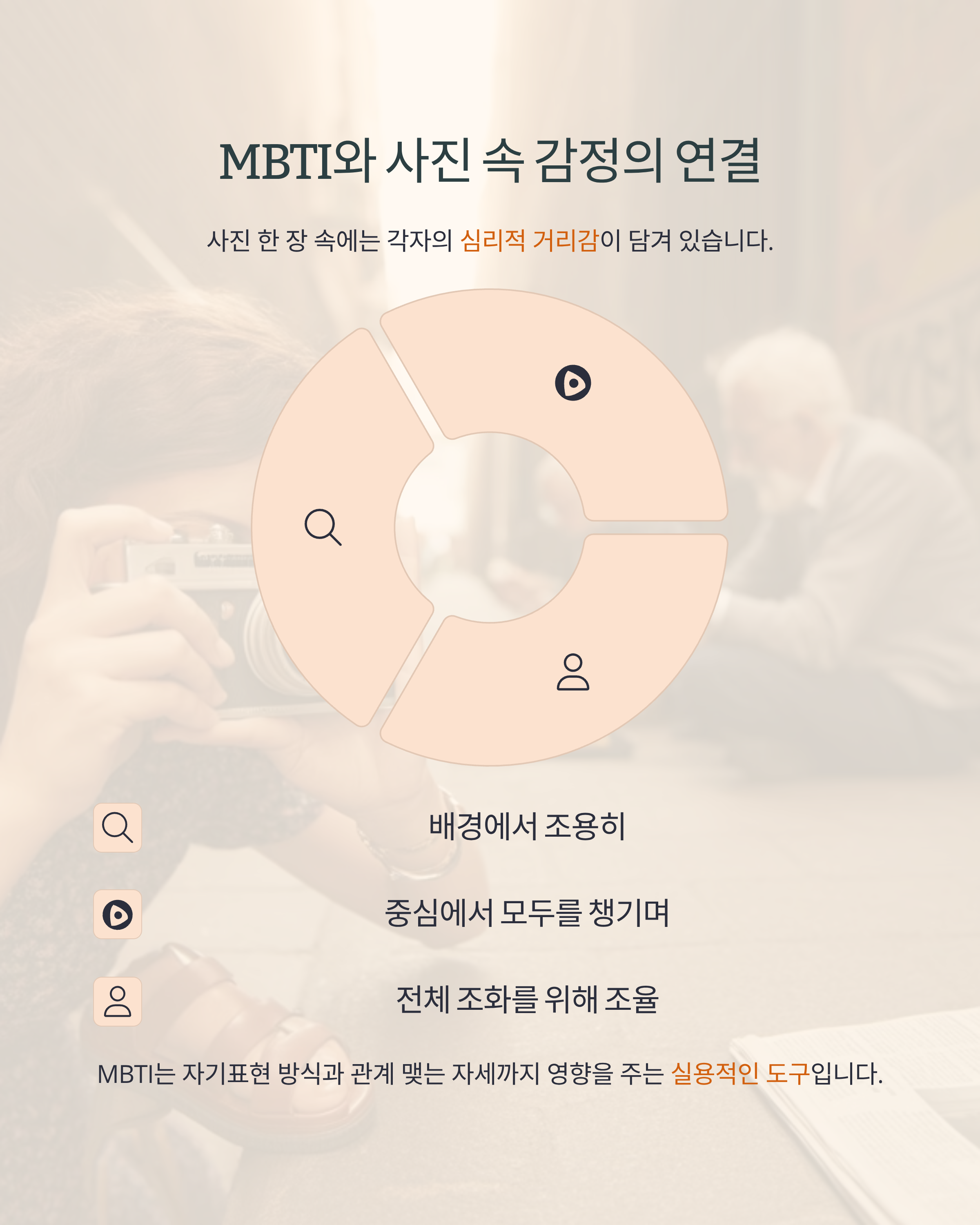 사진 한 장 속에는 MBTI 유형만큼이나 각자의 '심리적 거리감'이 담겨 있습니다.