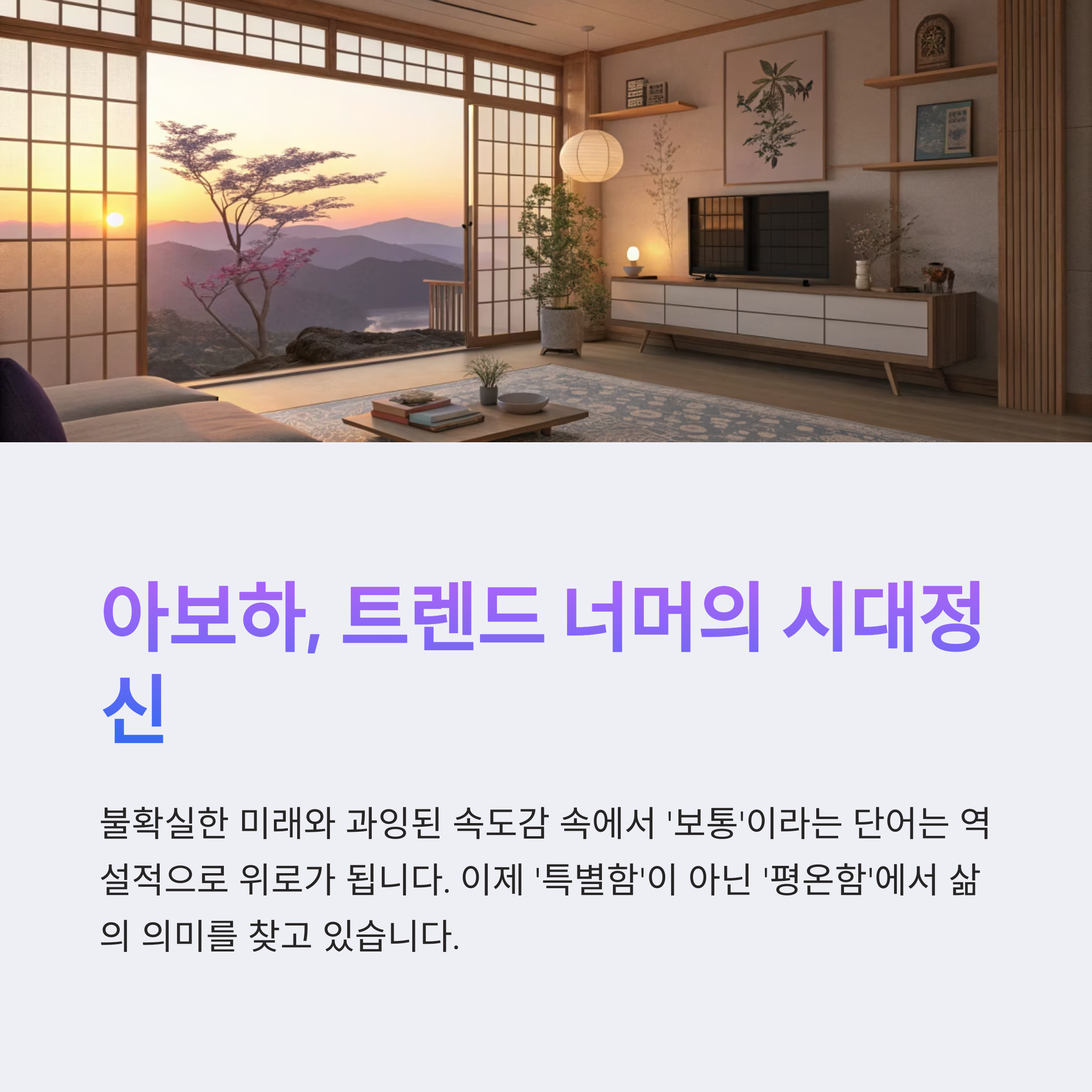 평범한 하루가 주목받는 시대입니다. 특별함보다 진정성, 화려함보다 마음의 안정이 더 중요해진 지금, MZ세대는 ‘아주 보통의 하루’, 즉 아보하(ABOHA) 라이프스타일을 일상 속 깊이 받아들이고 있습니다. 팬데믹을 거치며 일상의 가치를 다시 발견하게 된 이들은 과시 대신 자기만족, 자극 대신 루틴의 힘을 믿으며 새로운 삶의 흐름을 만들어가고 있습니다.