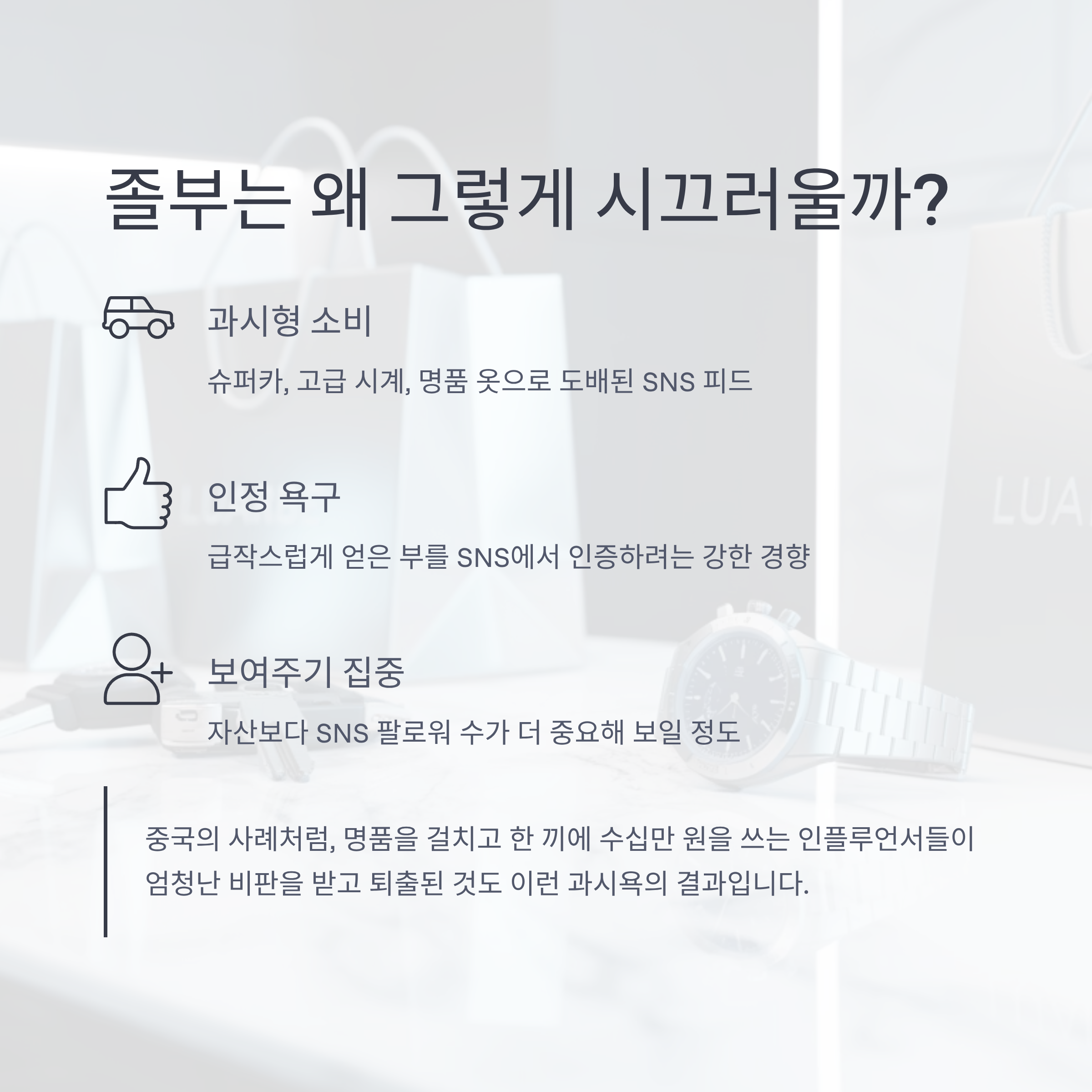 자산보다 SNS 팔로워 수가 더 중요해 보일 정도로, 졸부는 '보여주기'에 집중합니다.