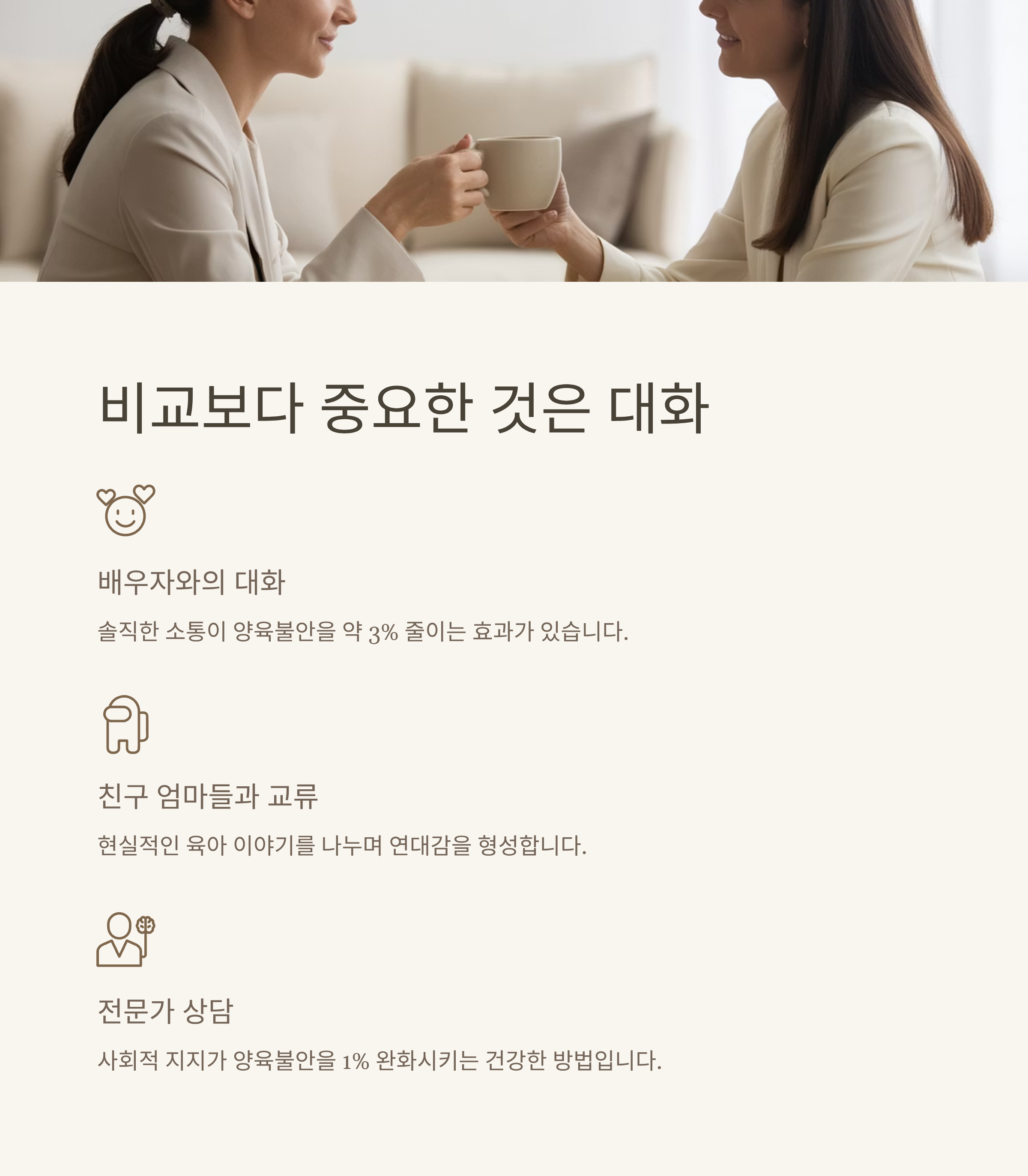 배우자와의 대화, 친구 엄마들과의 솔직한 교류, 전문가와의 상담 등은 SNS로 인한 불안을 완화시킬 수 있는 건강한 방법입니다.