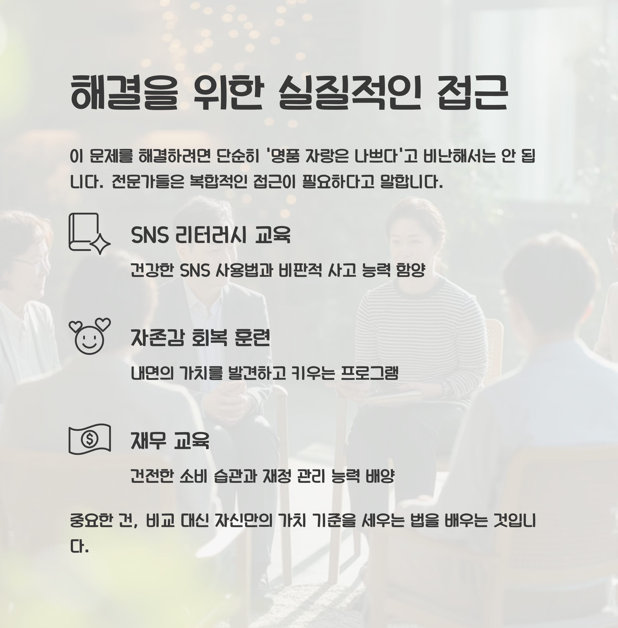 전문가들은 SNS 리터러시 교육, 자존감 회복 훈련, 건강한 결혼문화 조성, 재무 교육 등이 복합적으로 이뤄져야 한다고 말합니다. 중요한 건, 비교 대신 자신만의 가치 기준을 세우는 법을 배우는 겁니다.