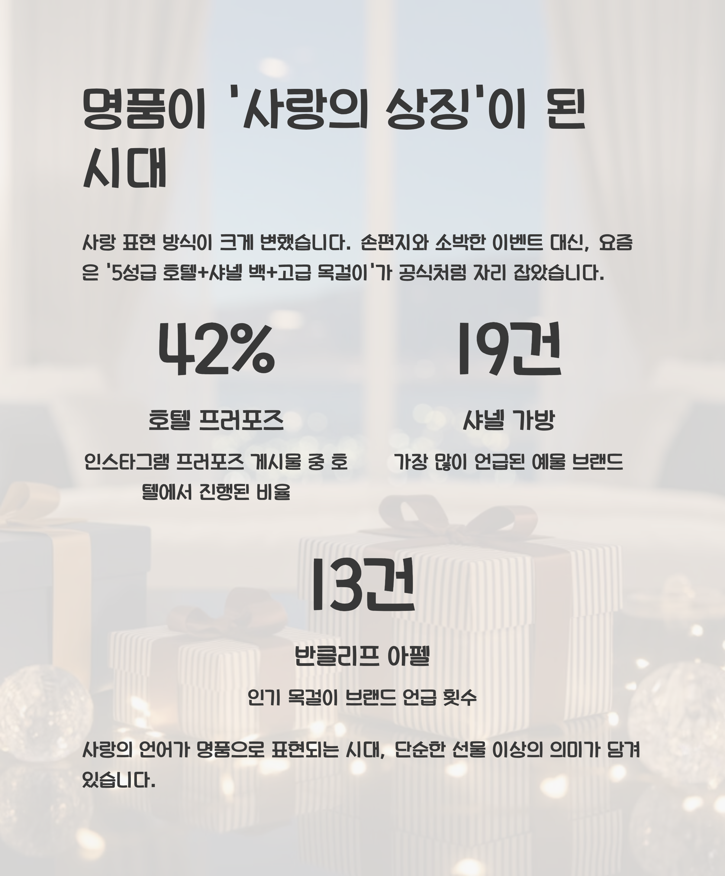 2024년 9월 성신여대 연구팀이 분석한 결과에 따르면, 인스타그램 프러포즈 게시물 중 42%가 호텔에서 진행된 것으로 나타났고, 가장 인기 있는 예물은 샤넬 가방과 반클리프 아펠 목걸이였습니다.