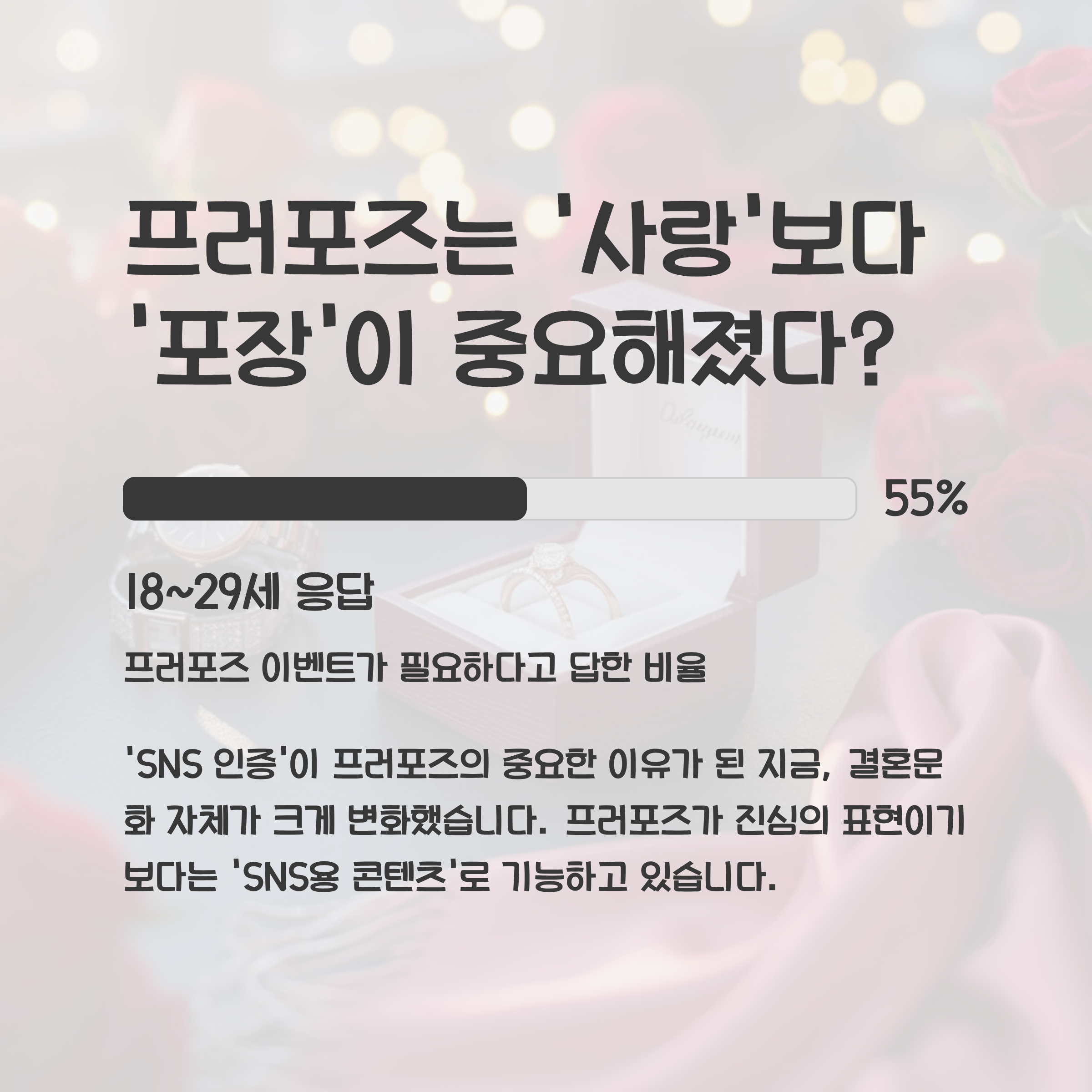 2025년 결혼 인식 조사 결과에 따르면, 프러포즈 이벤트가 필요하다고 답한 18~29세는 55%. 다른 세대보다 월등히 높았어요. 이건 프러포즈가 진심의 표현이기보다는 ‘SNS용 콘텐츠’로 기능하고 있다는 의미이기도 합니다.