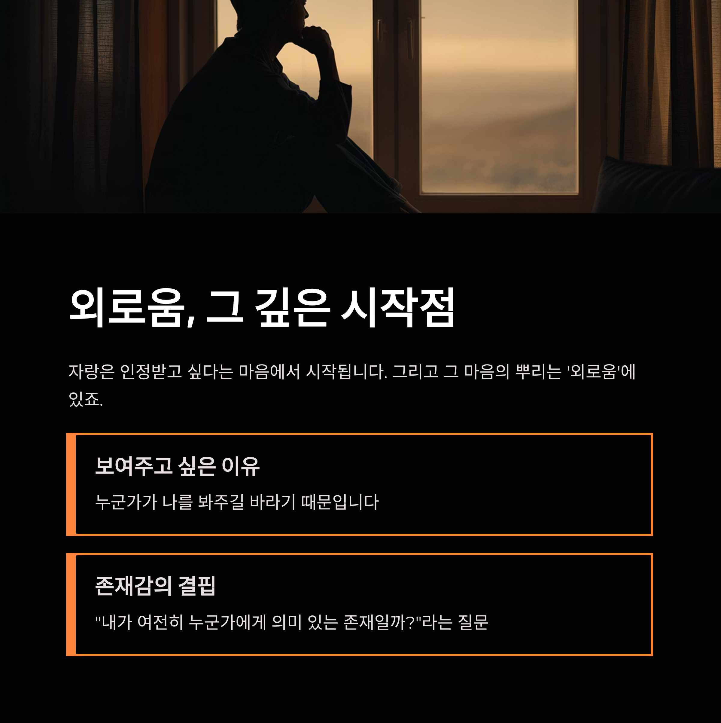 한 번 자랑을 멈춰보면, 그 다음엔 아무것도 할 말이 없어지는 순간이 찾아옵니다.