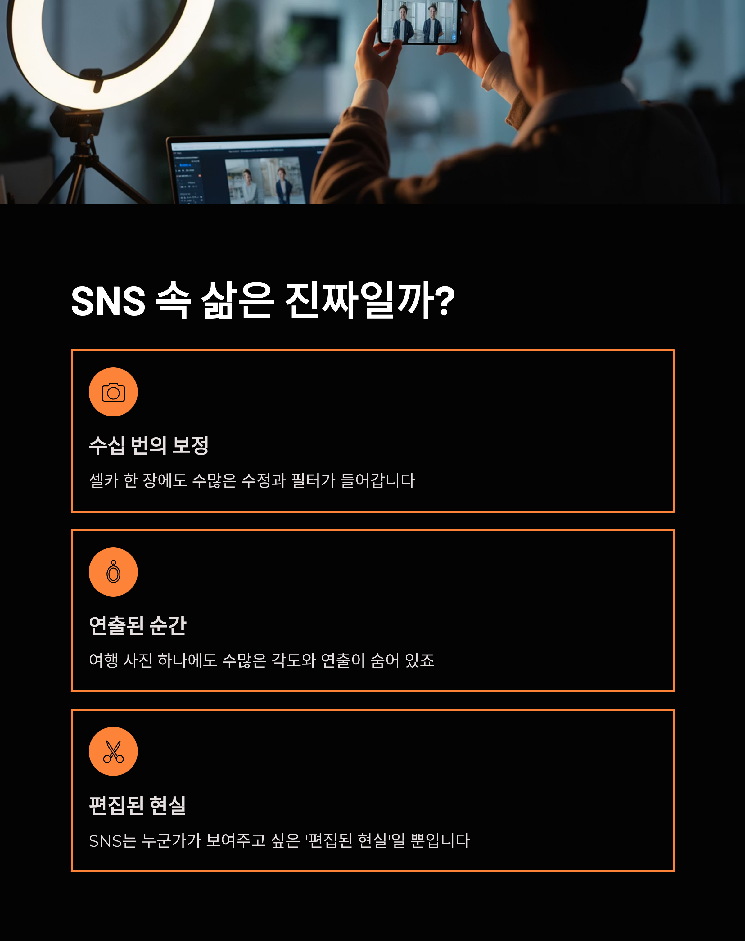 사실 SNS는 현실을 반영하는 창이 아니라, 누군가가 보여주고 싶은 ‘편집된 현실’일 뿐입니다.