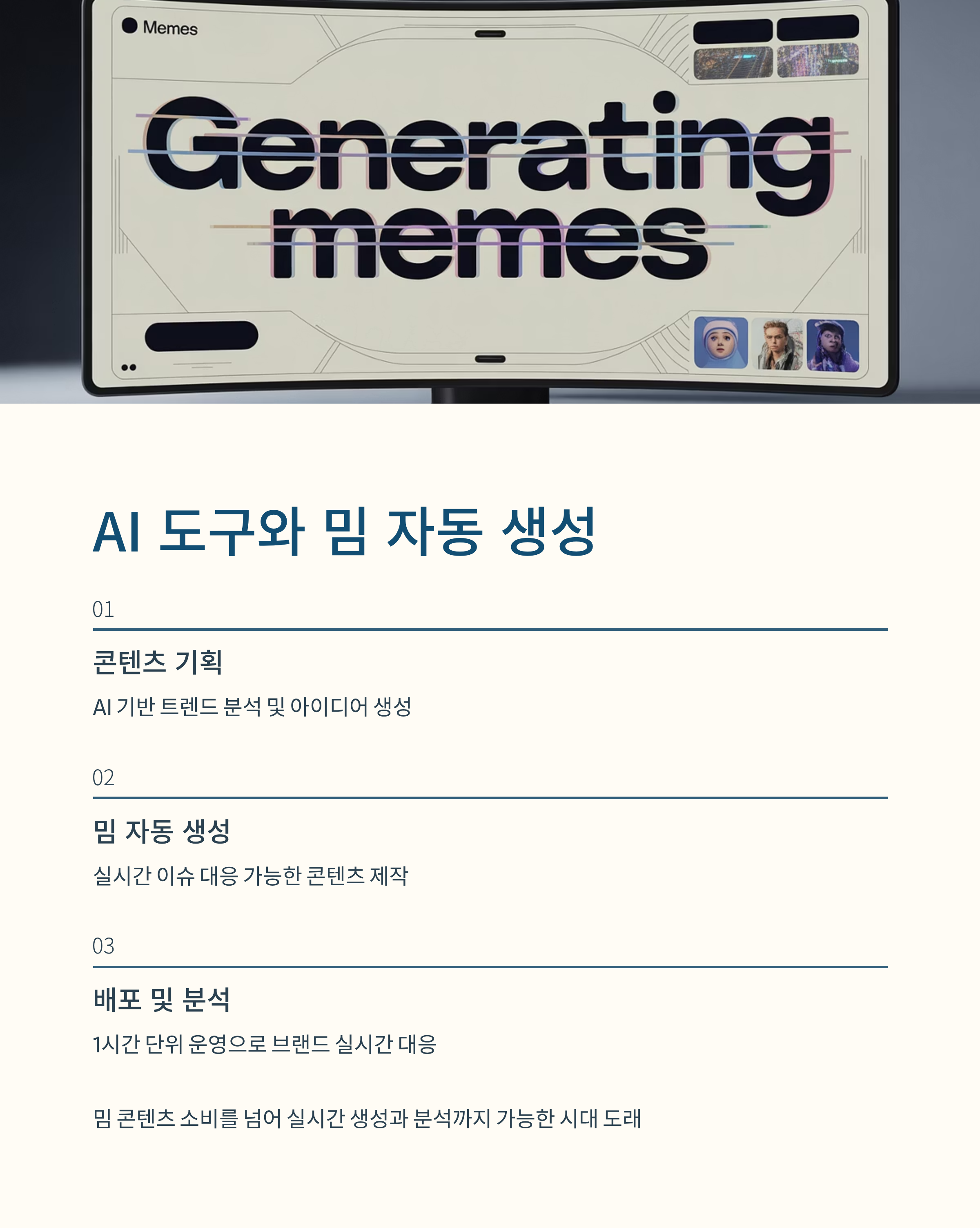 최근에는 AI를 기반으로 한 밈 자동 생성 도구가 활성화되며, 콘텐츠 기획부터 배포까지 1시간 단위로 운영이 가능해졌습니다. 이는 브랜드가 실시간 이슈에 대응할 수 있는 체계를 구축하는 데 큰 도움이 됩니다.