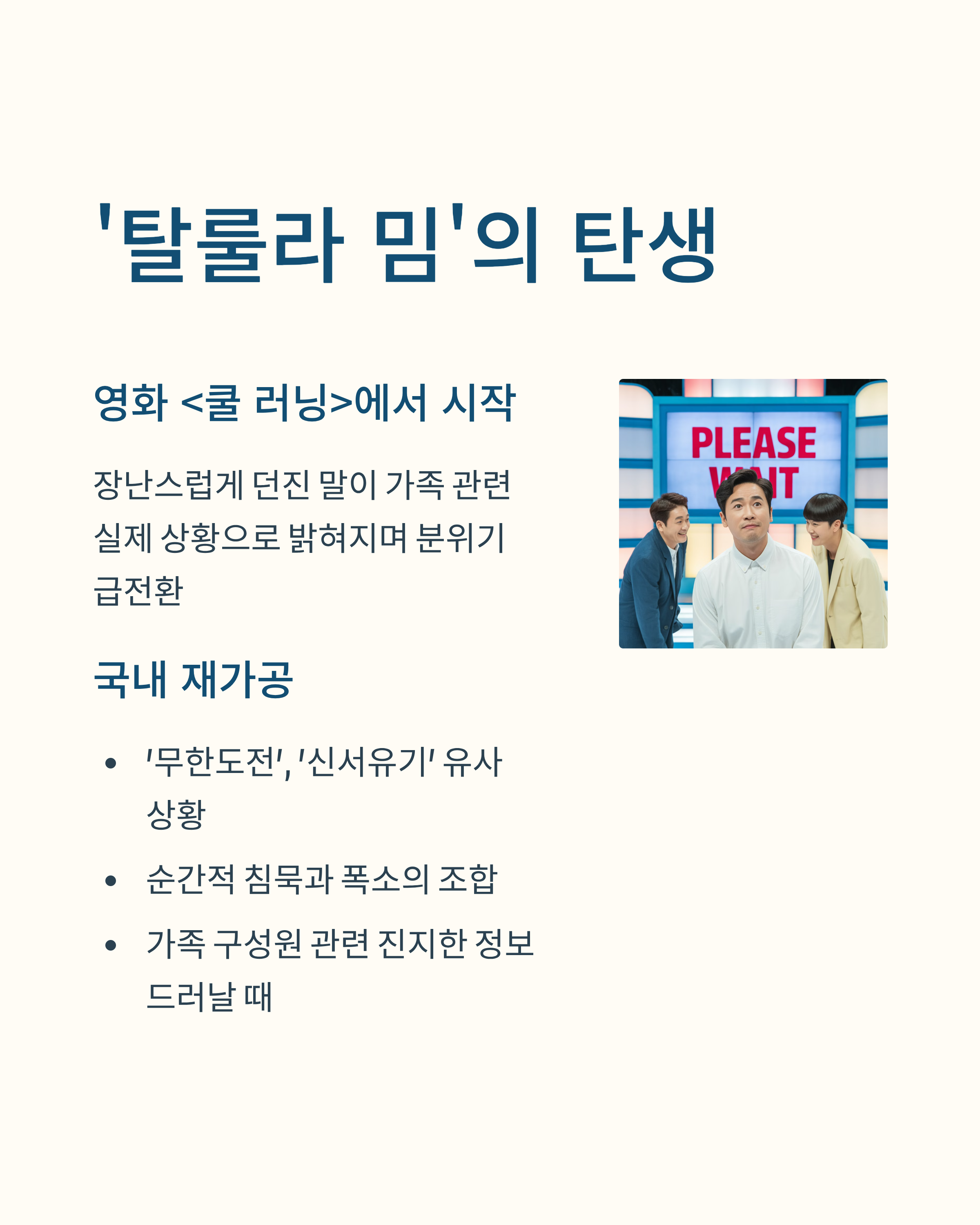 국내에서는 예능 프로그램 ‘무한도전’이나 ‘신서유기’에서 유사한 상황이 빈번하게 등장하면서 밈으로 재가공되었고, 가족 구성원과 관련된 진지한 정보가 드러날 때 발생하는 순간적인 침묵과 폭소가 주요 코드로 작용하고 있습니다.